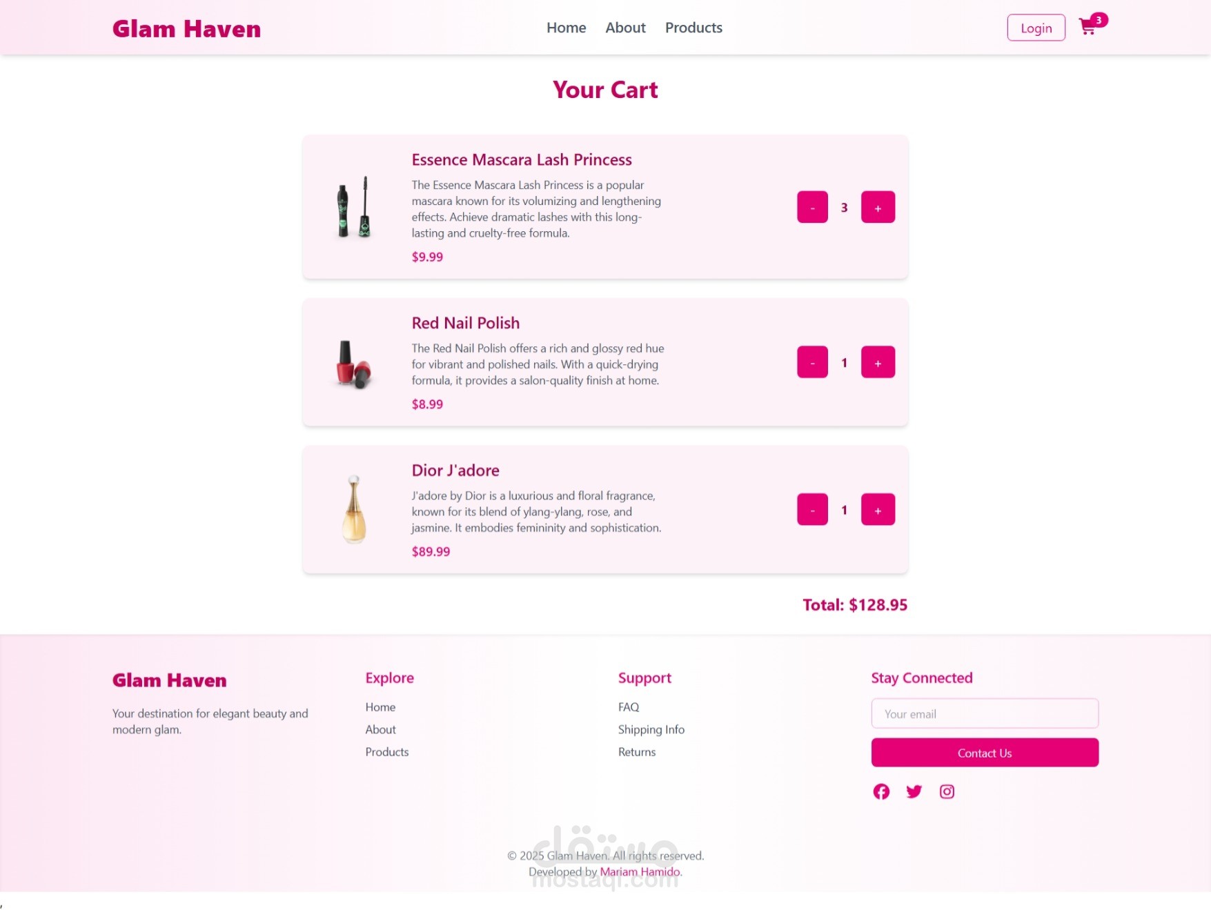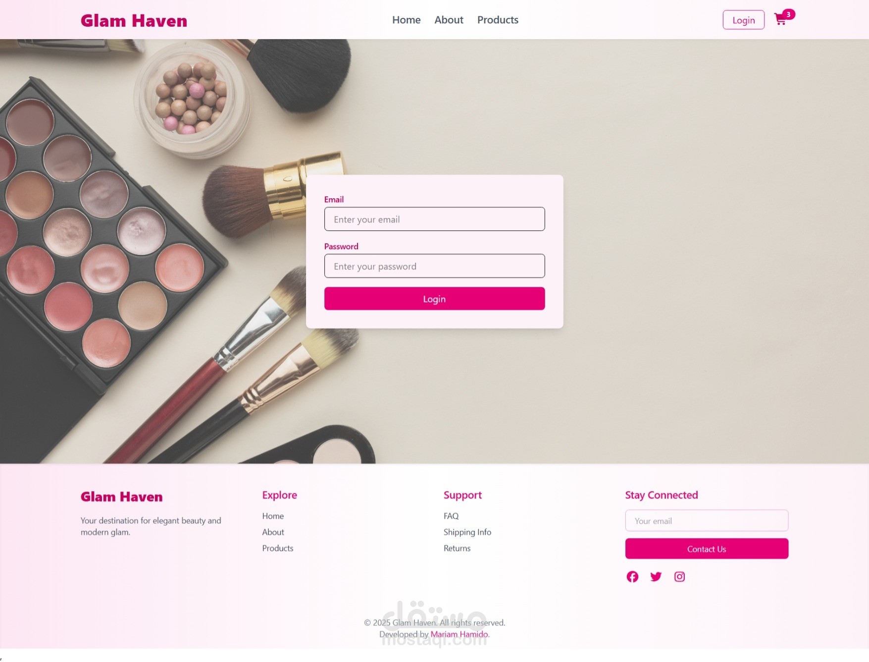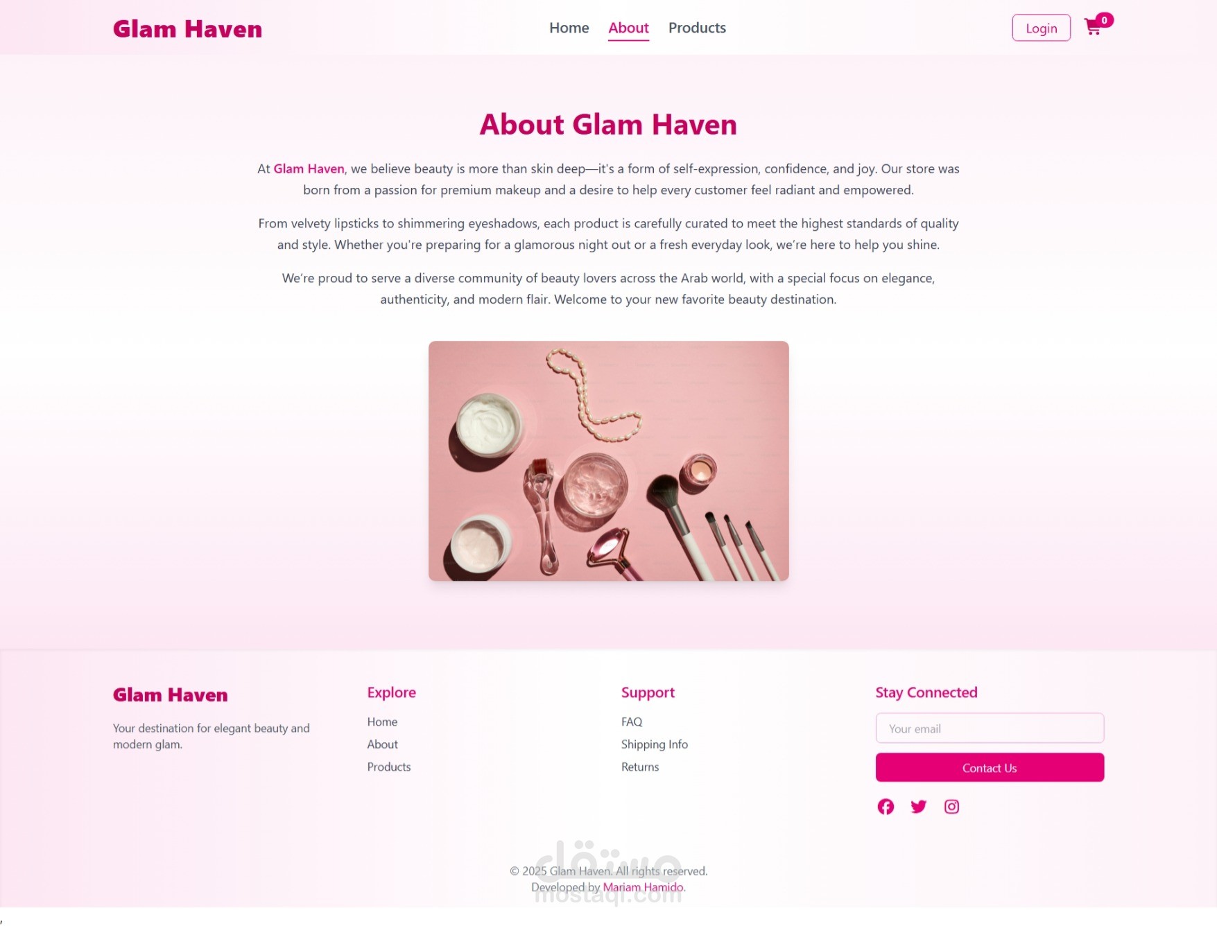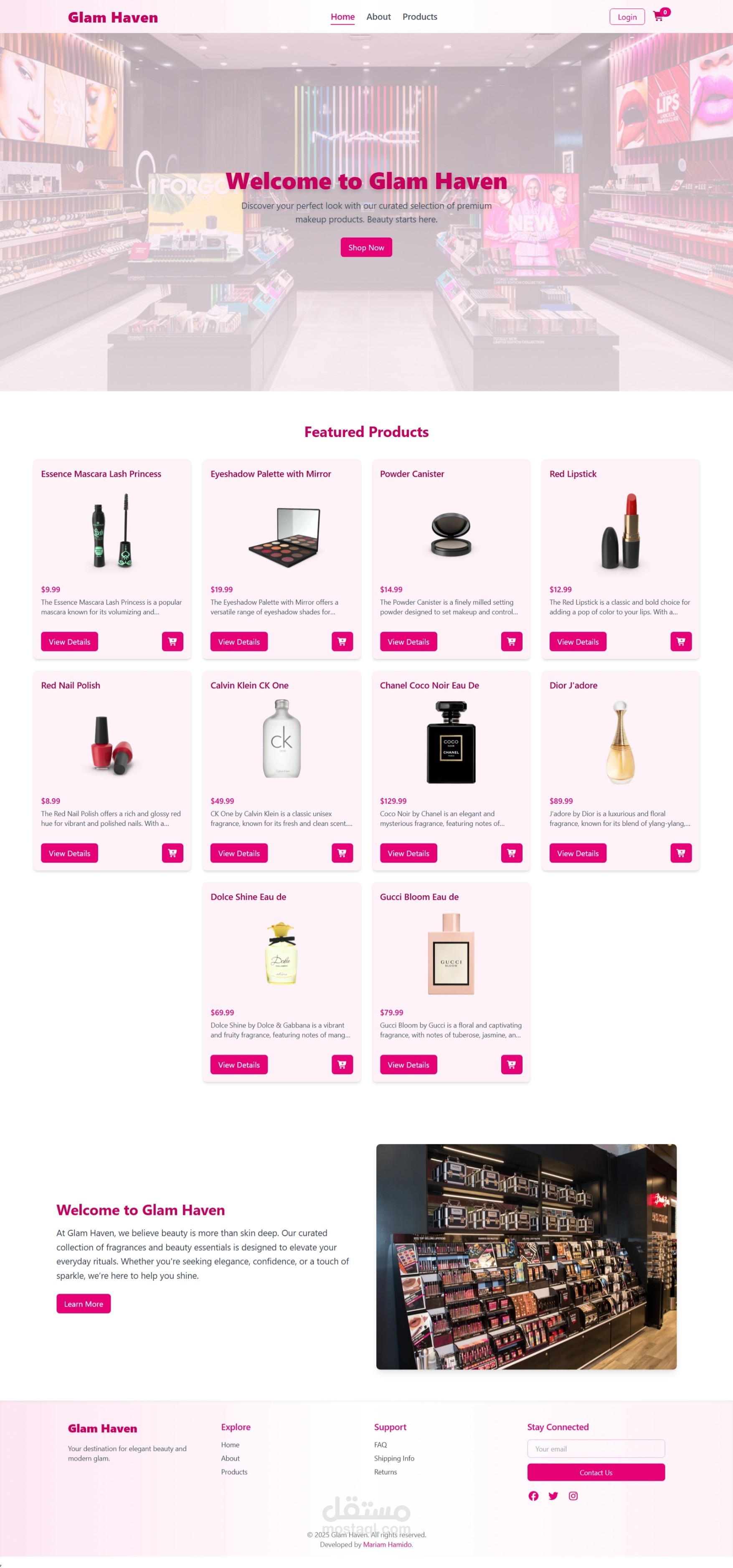 أنجزت مؤخرًا مشروع واجهة متجر إلكتروني باسم Glam Haven، مصمم خصيصًا لتقديم تجربة مستخدم سلسة ومريحة.