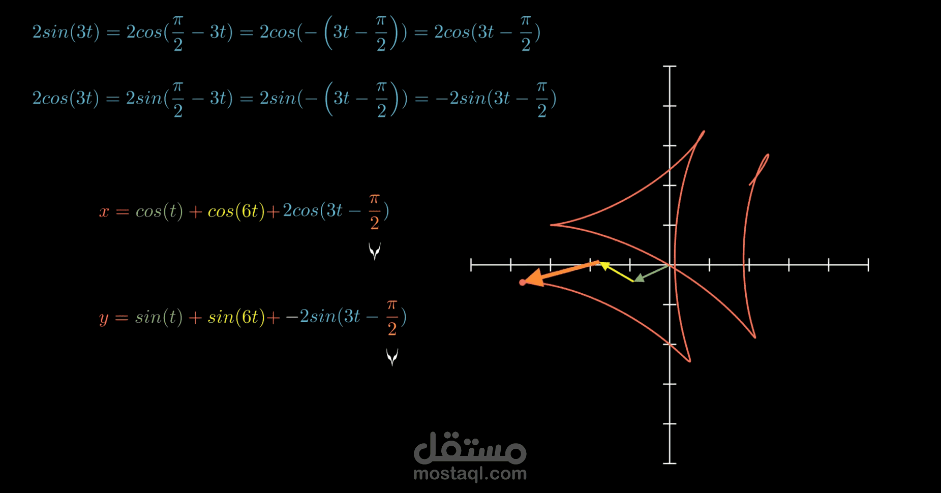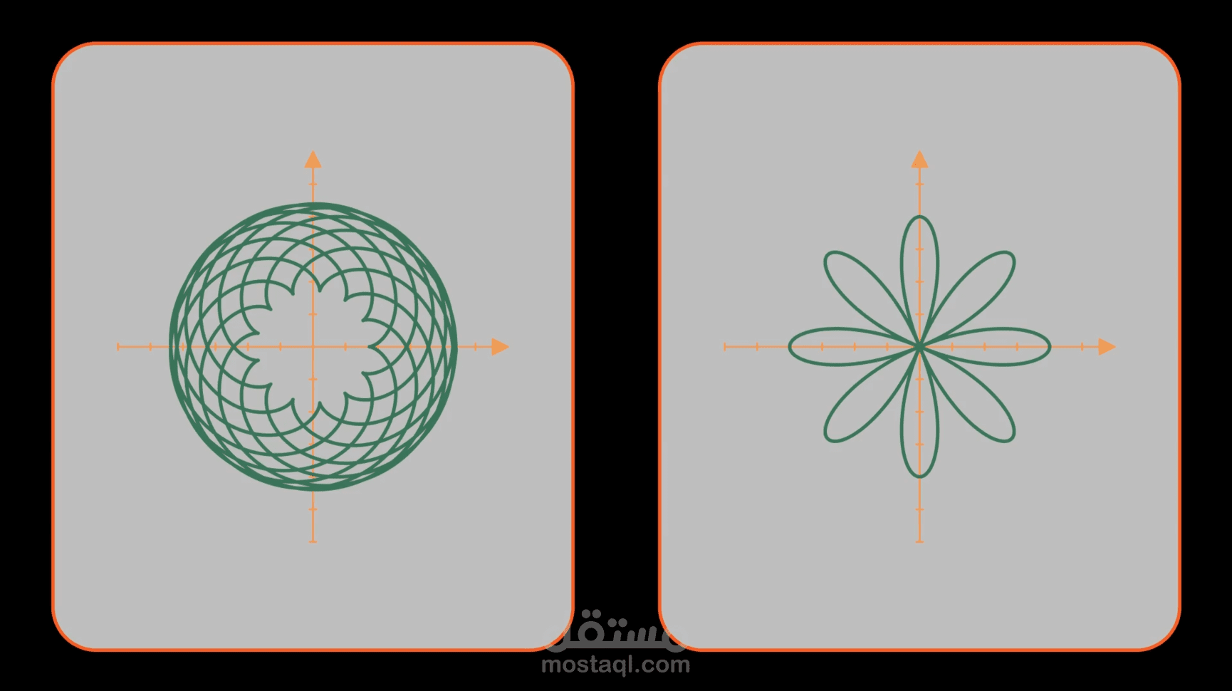 بعد ذلك شرحت كيف يمكن لنفس المبدأ أن يُستخدم في إنشاء أشكال أكثر تعقيدًا، مثل المنحنيات الدائرية المتعددة الأوراق (rose curves) والـ cycloid، مع الاعتماد على التحريك التدريجي (animations) لإبراز العلاقة بين المعادلات والصورة الناتجة.