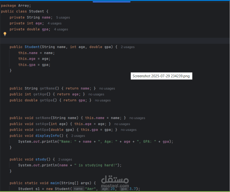 أنا بقدّم كود Java منسّق ومحترف لتصميم كائنات (Classes) واقعية زي "طالب"، "موظف"، أو "مستخدم"، باستخدام مبادئ البرمجة الكائنية (OOP).