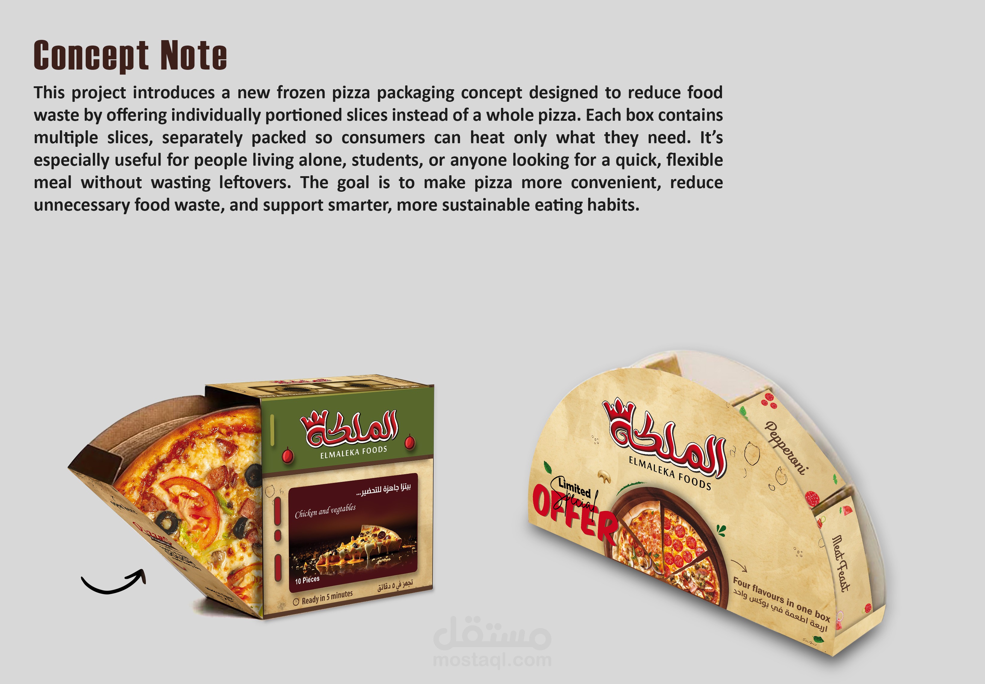 This project introduces a new frozen pizza packaging concept designed to reduce food waste by offering individually portioned slices instead of a whole pizza. Each box contains multiple slices, separately packed so consumers can heat only what they need. It’s especially useful for people living alone, students, or anyone looking for a quick, flexible meal without wasting leftovers. The goal is to make pizza more convenient, reduce unnecessary food waste, and support smarter, more sustainable eating habits.