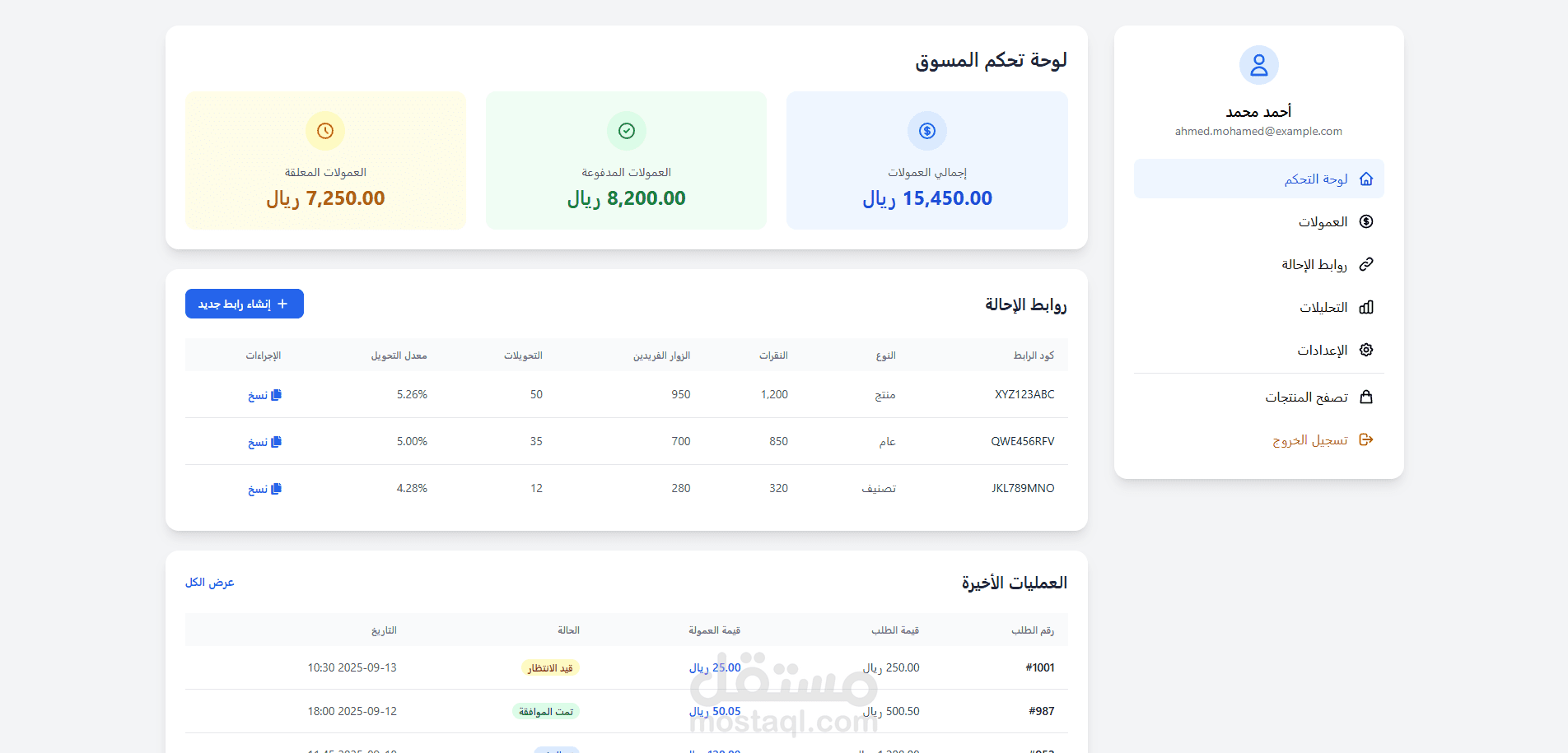 حلول الدفع المتكاملة: تدعم المنصة طرق دفع متنوعة مع نظام محاسبي آلي يضمن توزيع الأموال بشكل عادل بين الموردين والمسوقين.