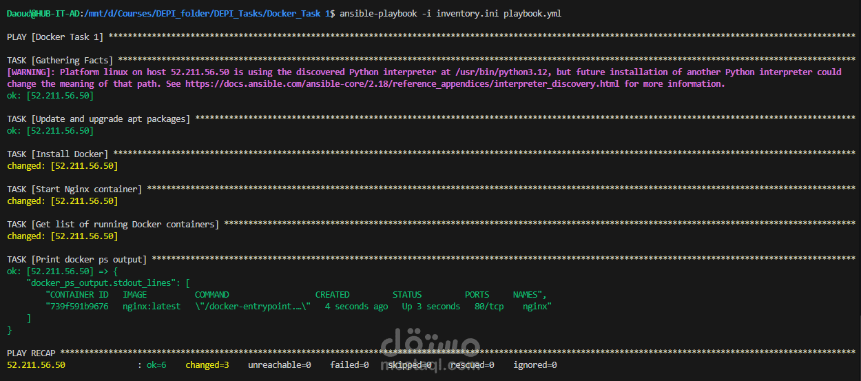 This project demonstrates how to use Ansible to automate the deployment of an Nginx web server inside a Docker container on an AWS EC2 Ubuntu instance.