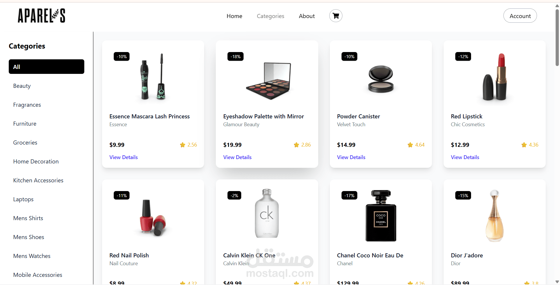 التصنيفات (Categories): تصفح جميع الأقسام واستعراض المنتجات الخاصة بكل قسم.