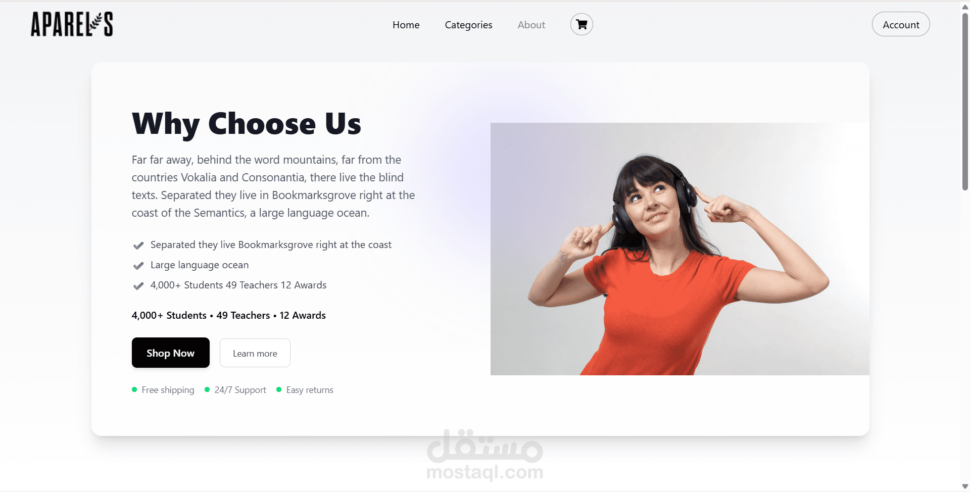 عملت على تطوير تطبيق ويب للتجارة الإلكترونية متكامل باستخدام React.js و Tailwind CSS، مع التركيز على التصميم العصري وسهولة الاستخدام عبر مختلف الأجهزة (Responsive Design).