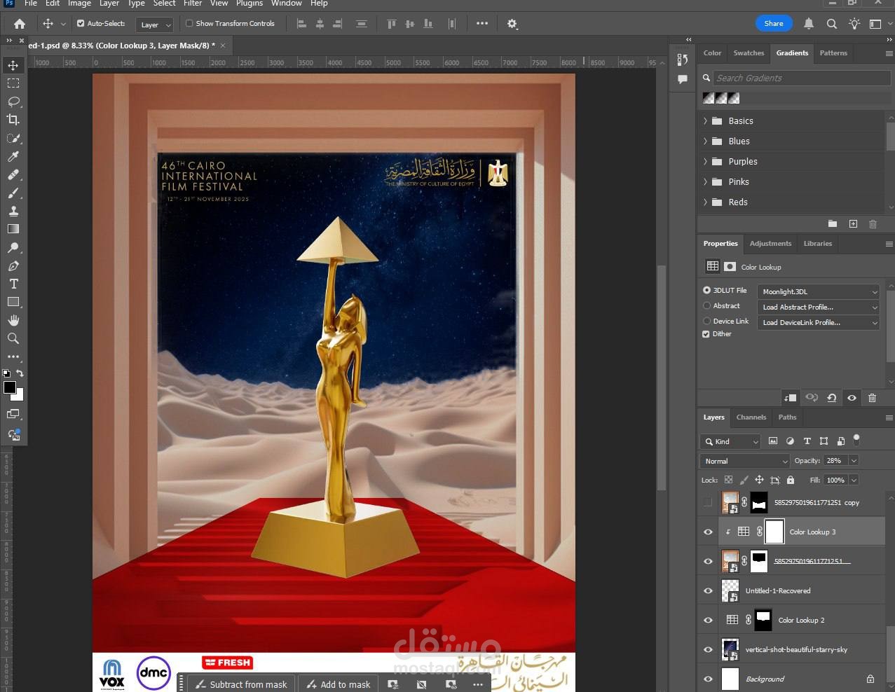 يجمع بين الفخامة والخيال، حيث يظهر تمثال الجائزة كبطل أساسي تحت سماء ليلية درامية، ما يعكس أجواء المهرجان ويدعو الجمهور للمشاركة.