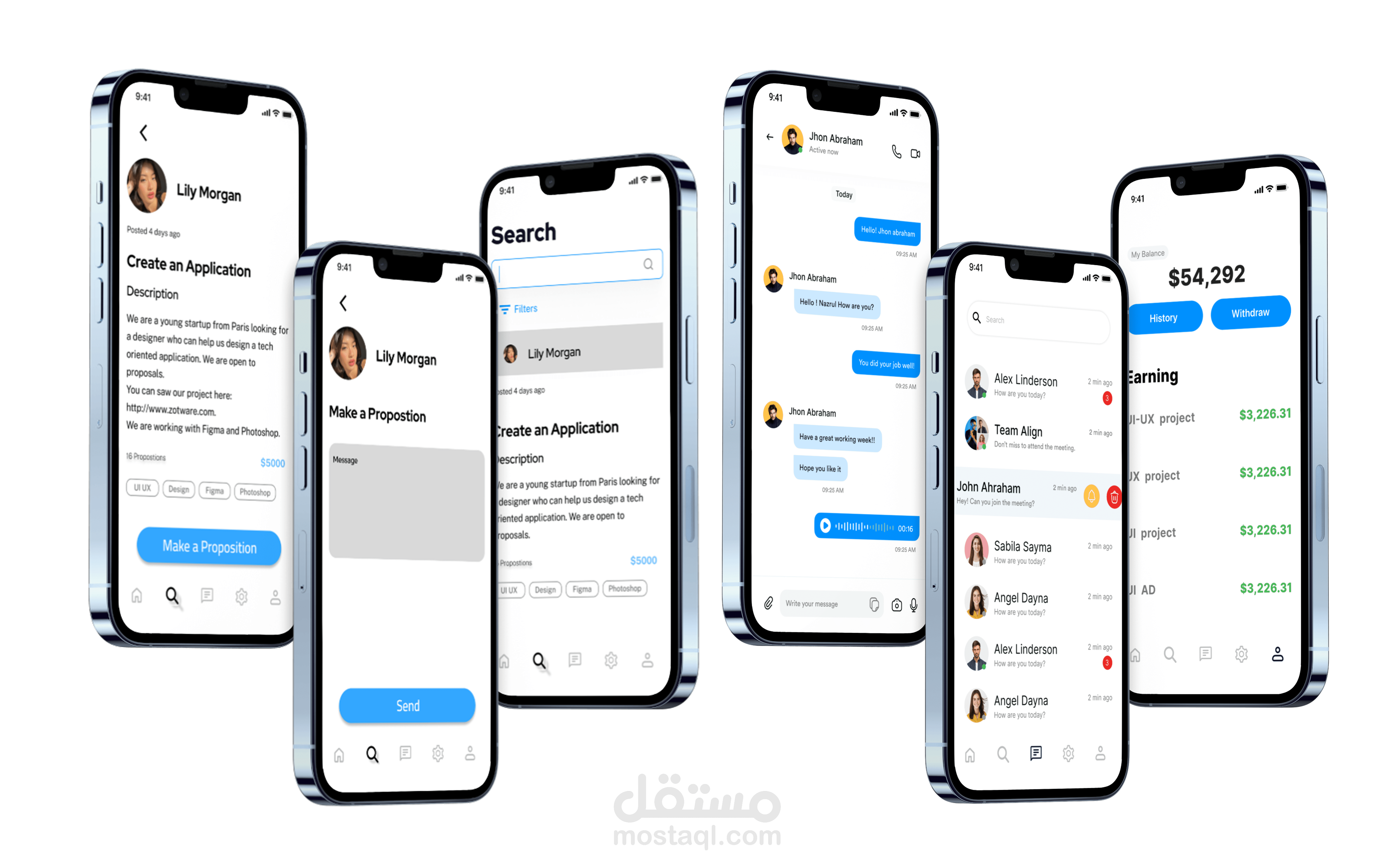 يشمل التصميم الصفحات الأولى للتطبيق مثل: