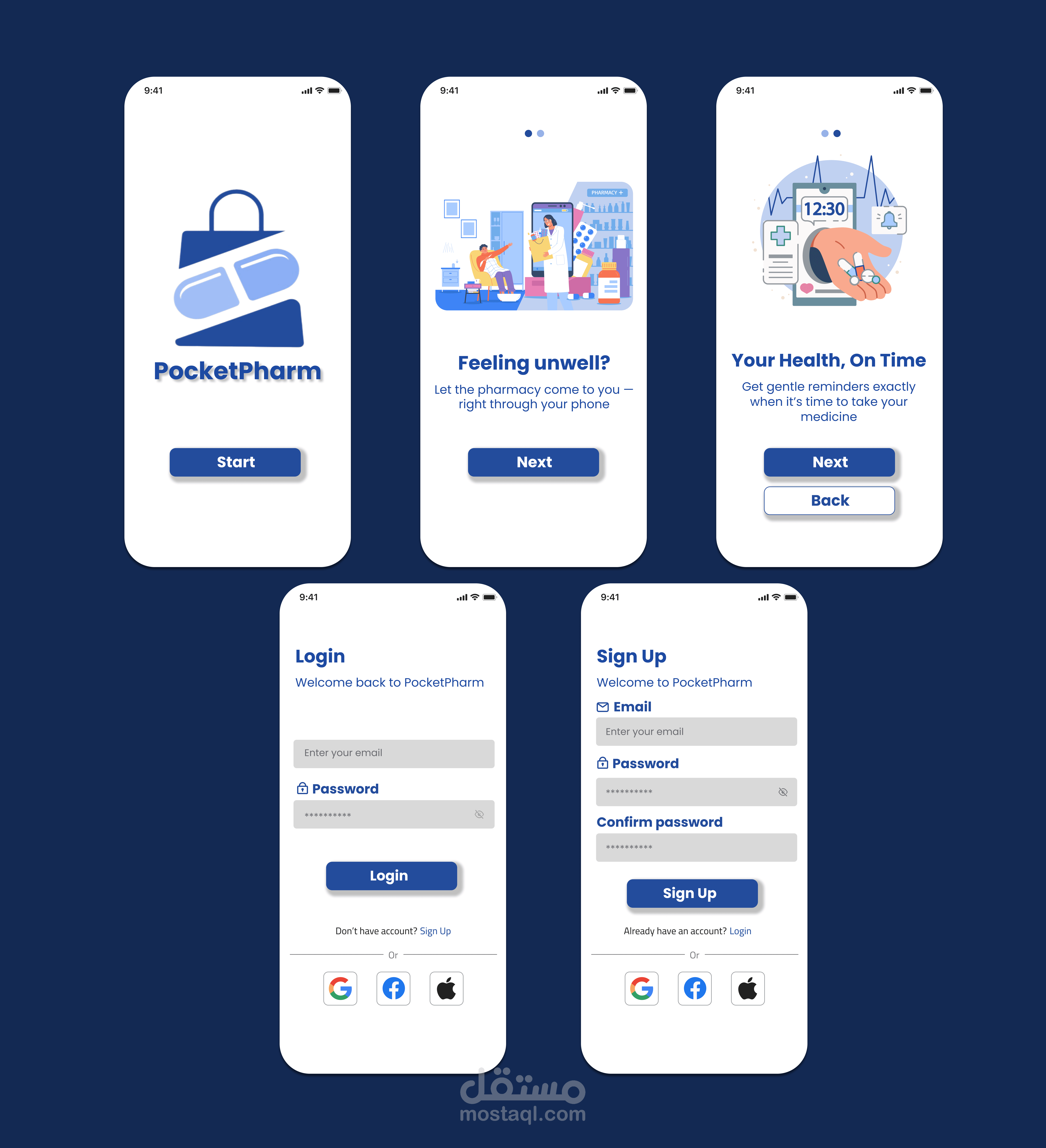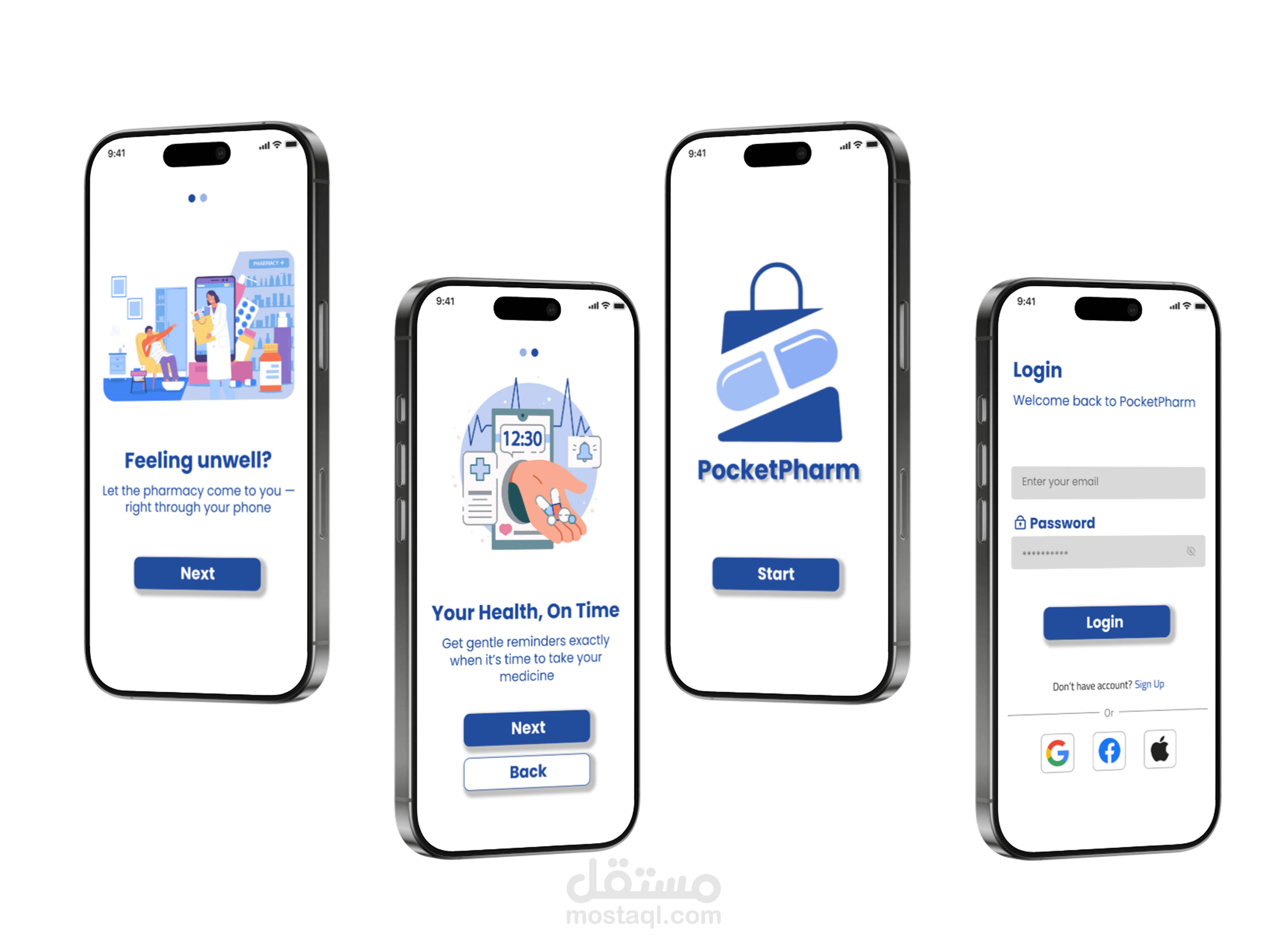 تصميم Prototype أولي لتطبيق PocketPharm، وهو تطبيق مخصص لطلب وتوصيل الأدوية من الصيدليات.