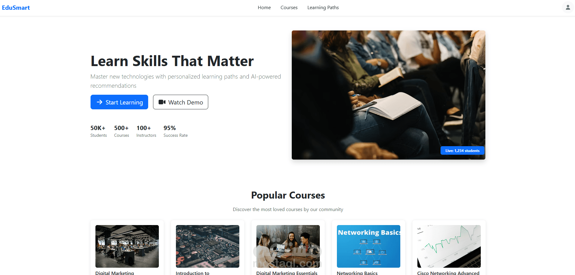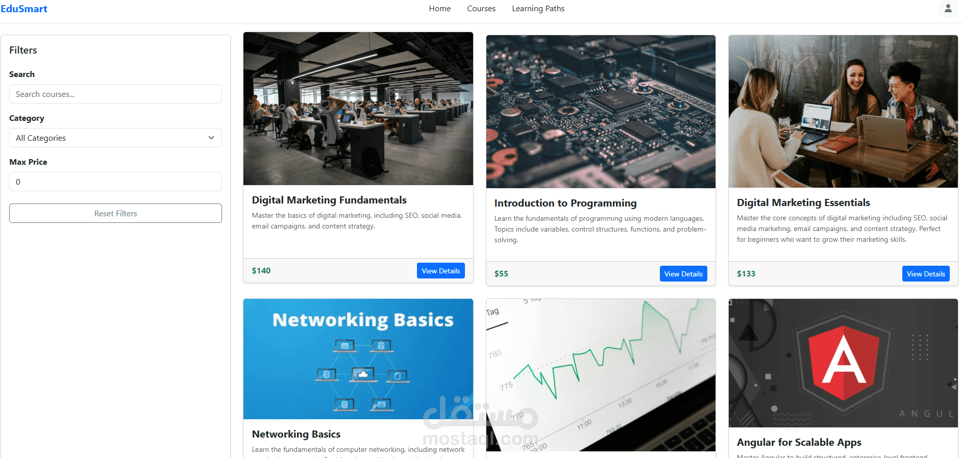قمت بتطوير وبناء منصة تعليمية متكاملة تسمح للطلاب بتصفح الدروس، مشاهدة تفاصيل الكورسات، وإدارة حساباتهم بسهولة.
