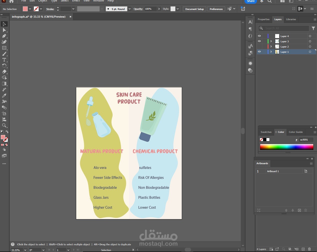 مقارنة بين منتجات البشرة الطبيعية والكيميائية باستخدام رسومات مبسطة الألوان تم اختيارها بعناية، لتسهيل فهم الفروقات بشكل سريع وجذاب