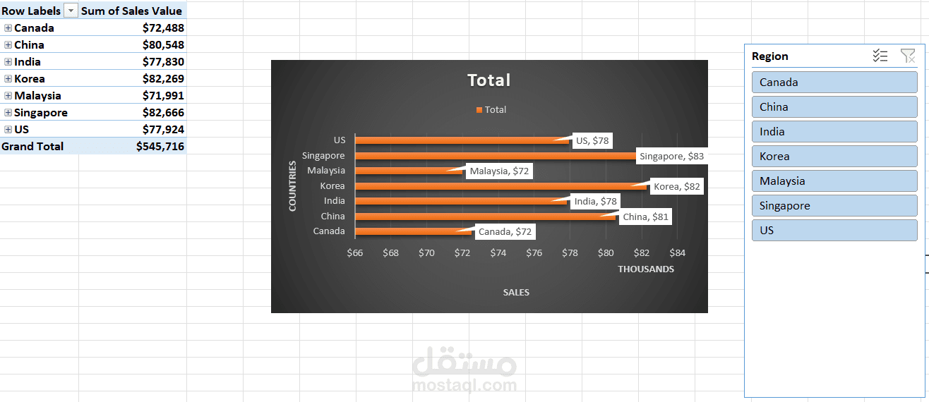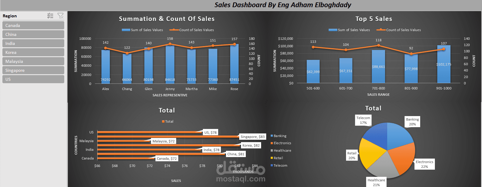 هذا الـ Sales Dashboard يقدّم رؤية شاملة واحترافية لأداء المبيعات، حيث يوضّح إجمالي القيم وعدد العمليات لكل ممثل مبيعات، ويعرض أعلى خمس فئات مبيعات بشكل مبسط، مع تحليل مقارن للمبيعات حسب الدول، بالإضافة إلى توزيع القطاعات المختلفة عبر رسم بياني دائري يبرز مساهمة كل قطاع. كما يتيح شريط التصفية الجانبي التفاعل مع البيانات واختيار الدولة المطلوبة لمراجعة تفاصيلها. يهدف هذا الـ Dashboard إلى تسهيل فهم البيانات بسرعة ودقة، ودعم اتخاذ قرارات استراتيجية قائمة على تحليل بصري واضح وسهل الاستخدام.