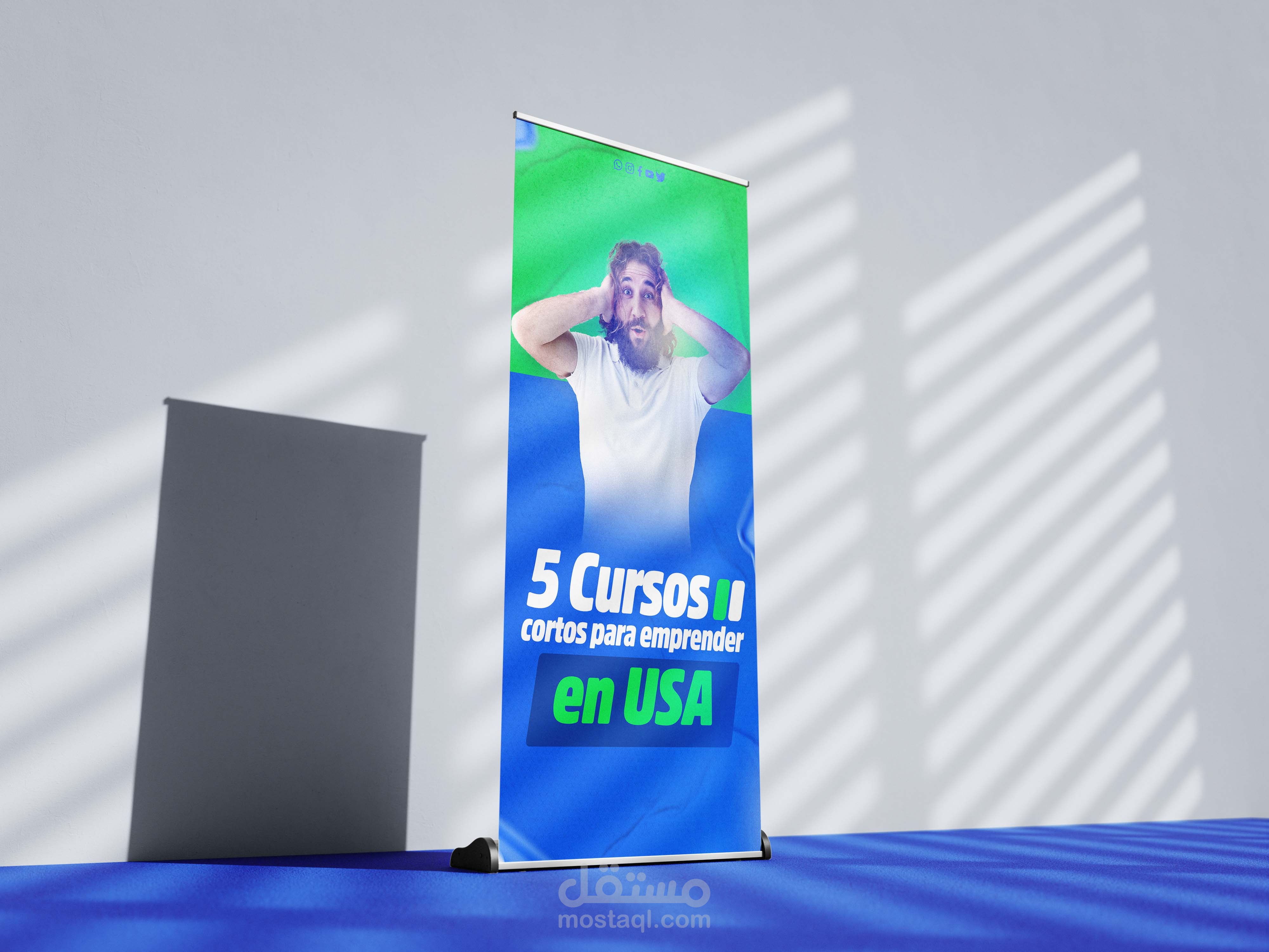 تصميم بانر إعلاني جذاب ومباشر للترويج لدورات قصيرة موجهة لرواد الأعمال في الولايات المتحدة.