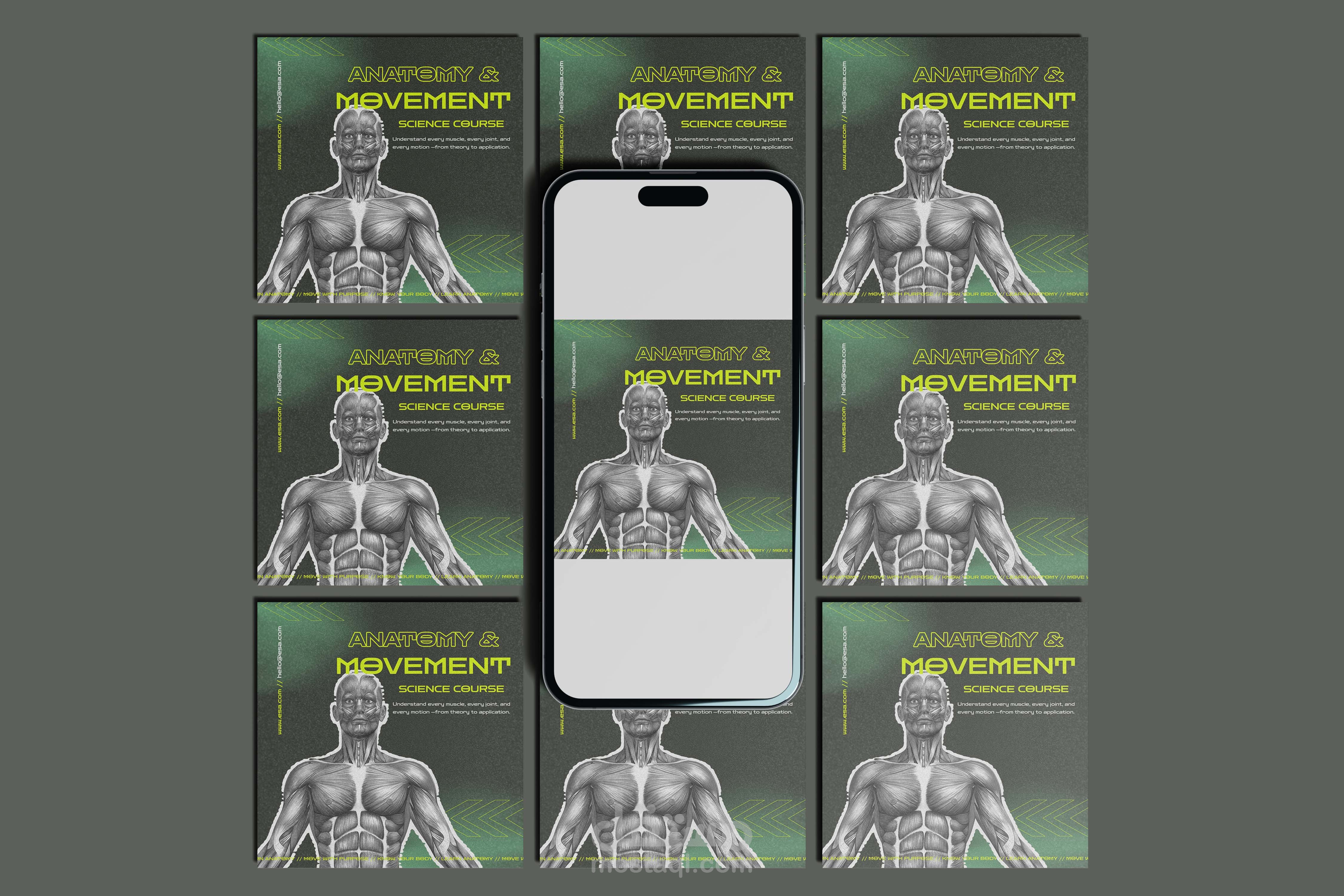 تصميم بوست دعائي لدورة علمية بعنوان Anatomy & Movement Science Course، يركز على إبراز الجانب العلمي بطريقة بصرية جذابة.