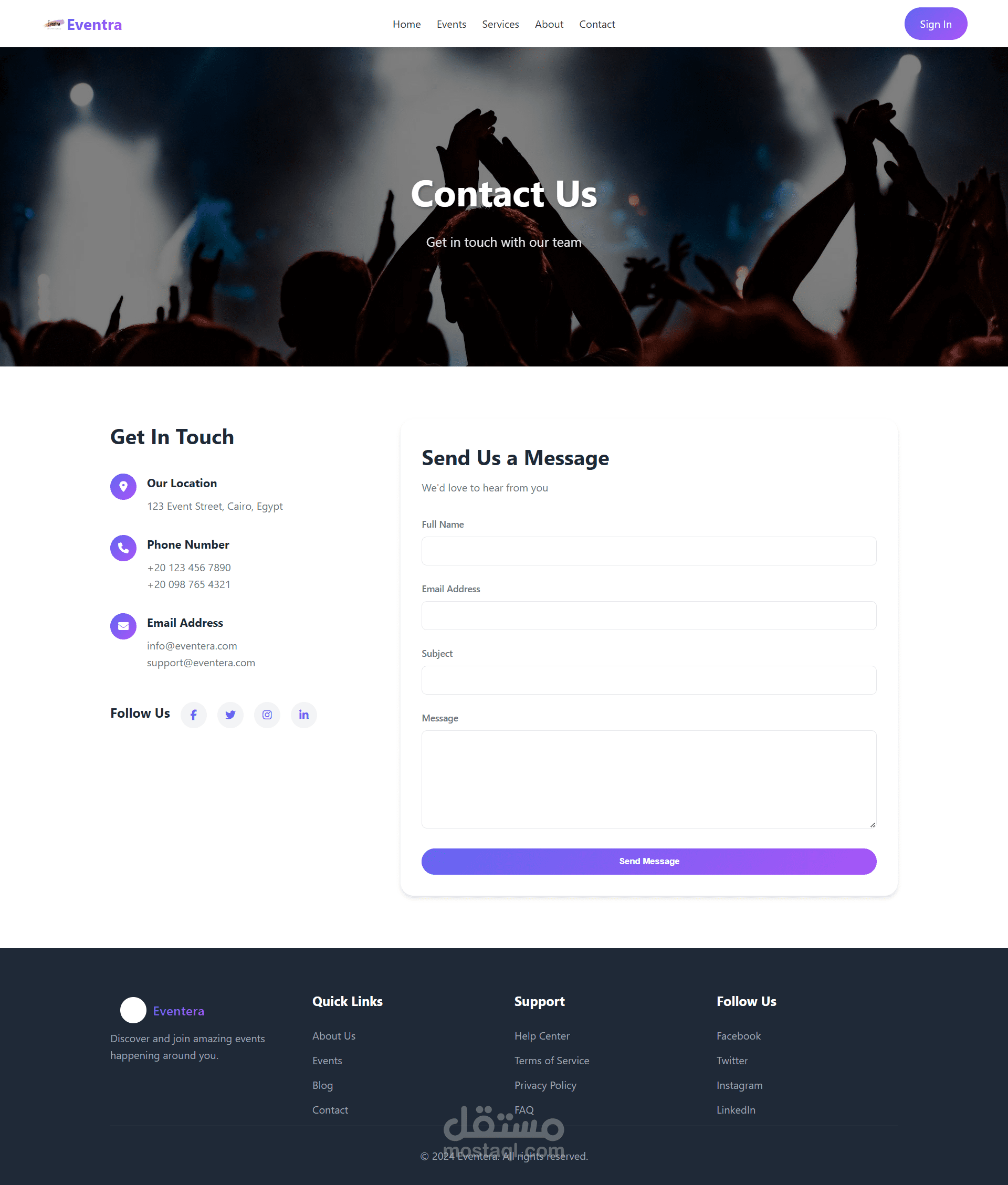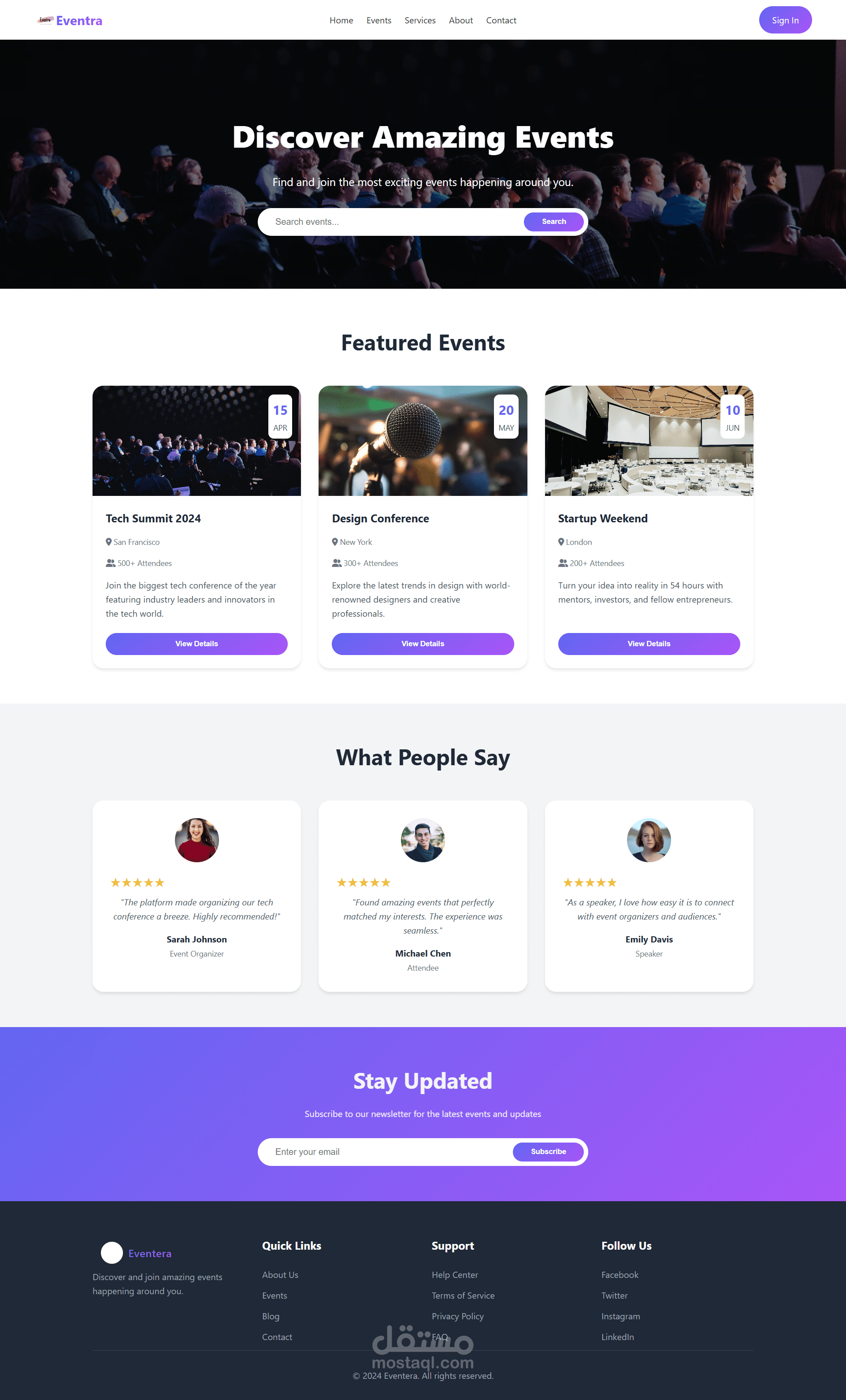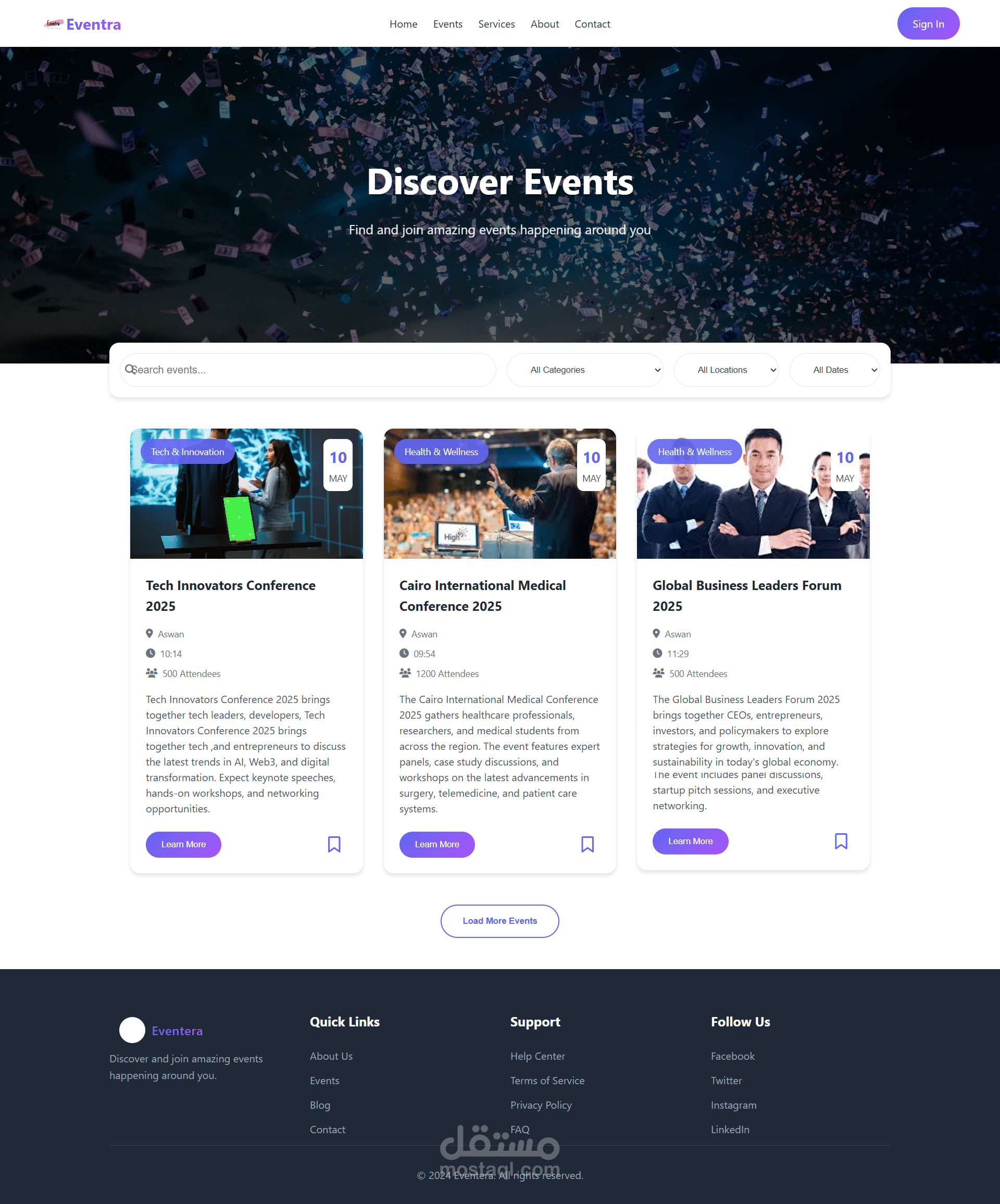 قمت بتطوير منصة Eventra وهي موقع إلكتروني وتطبيق ويب متعدد الأدوار يهدف إلى مساعدة المستخدمين في اكتشاف الفعاليات القريبة منهم والتفاعل معها بسهولة.