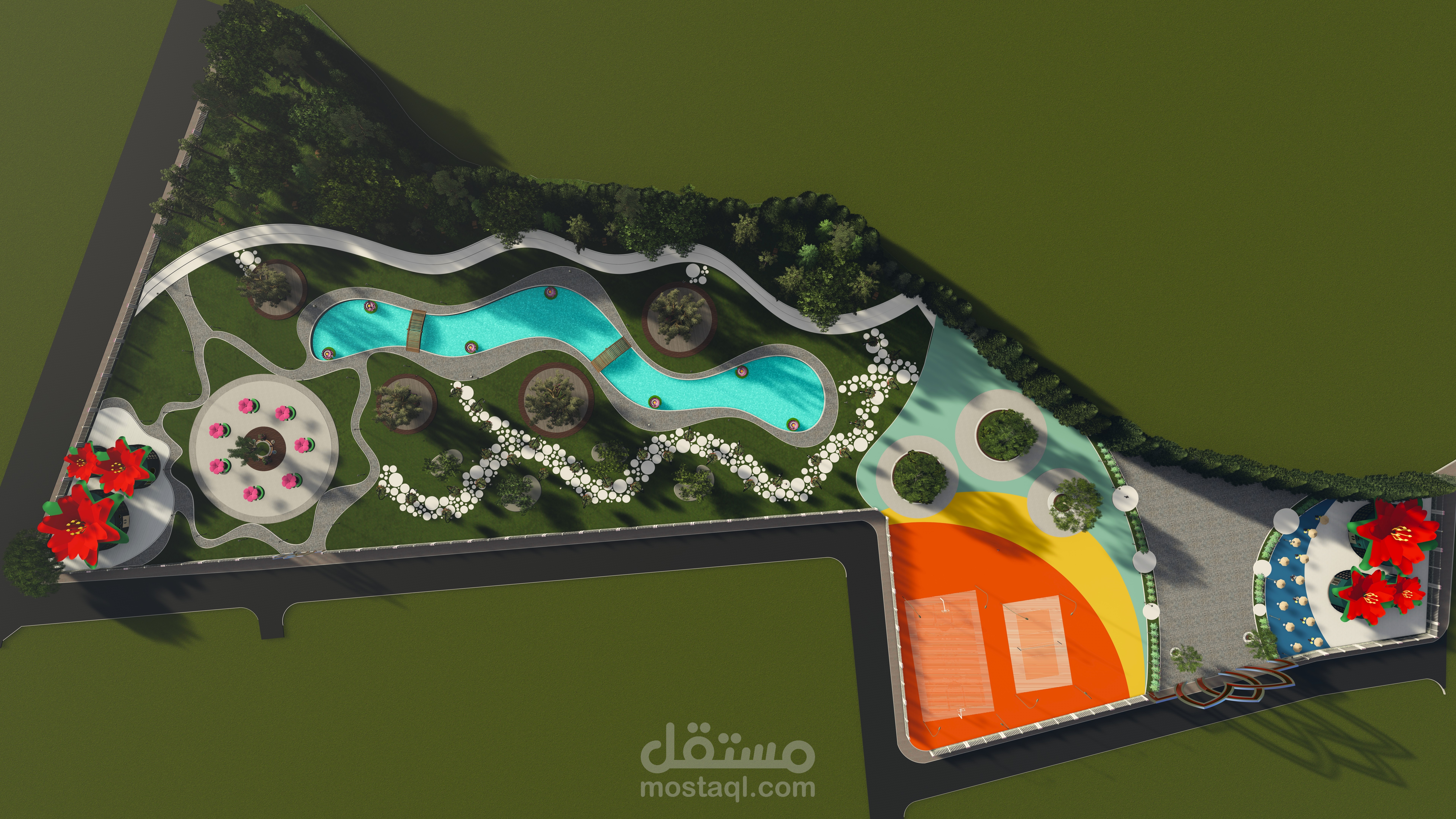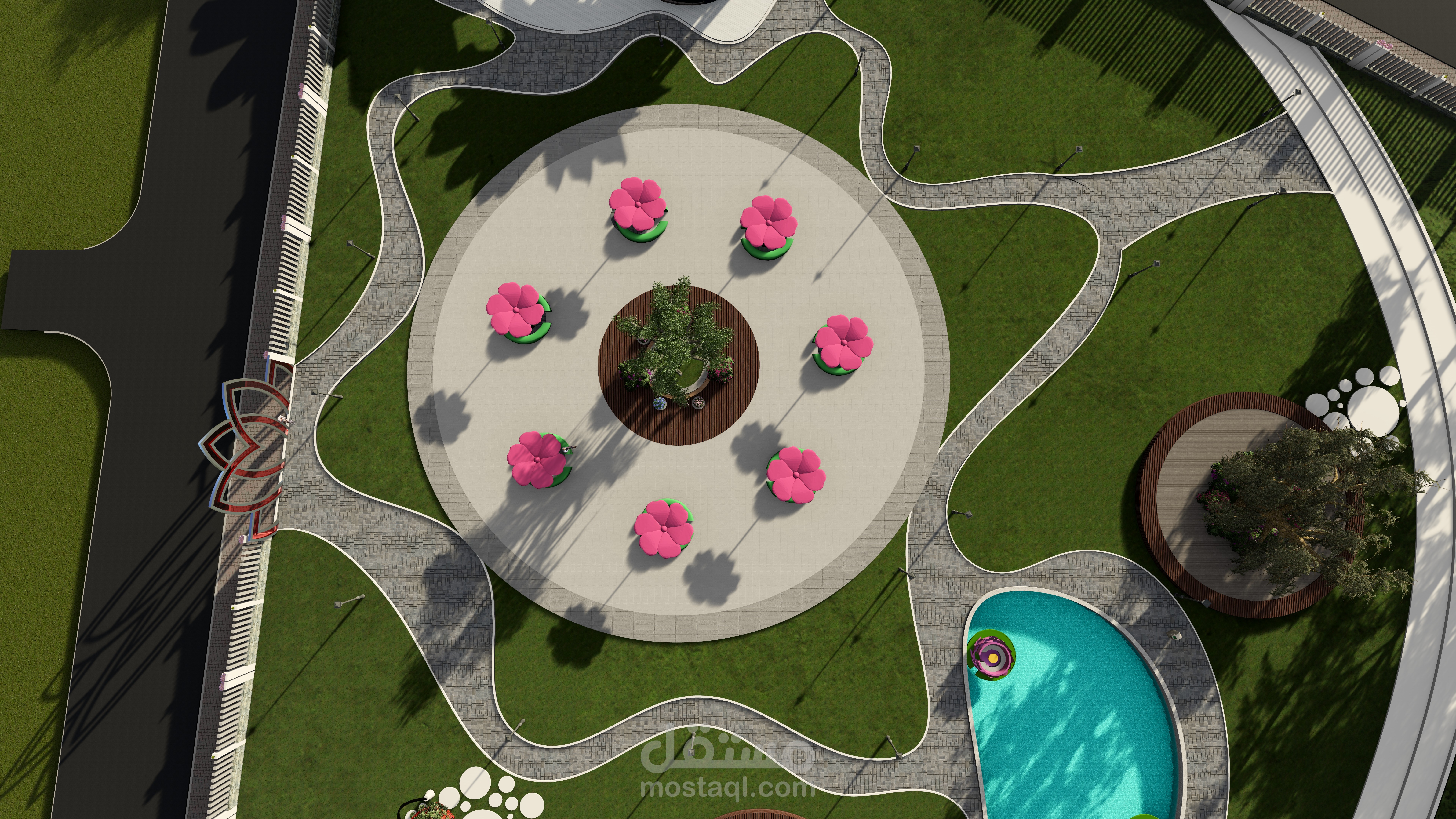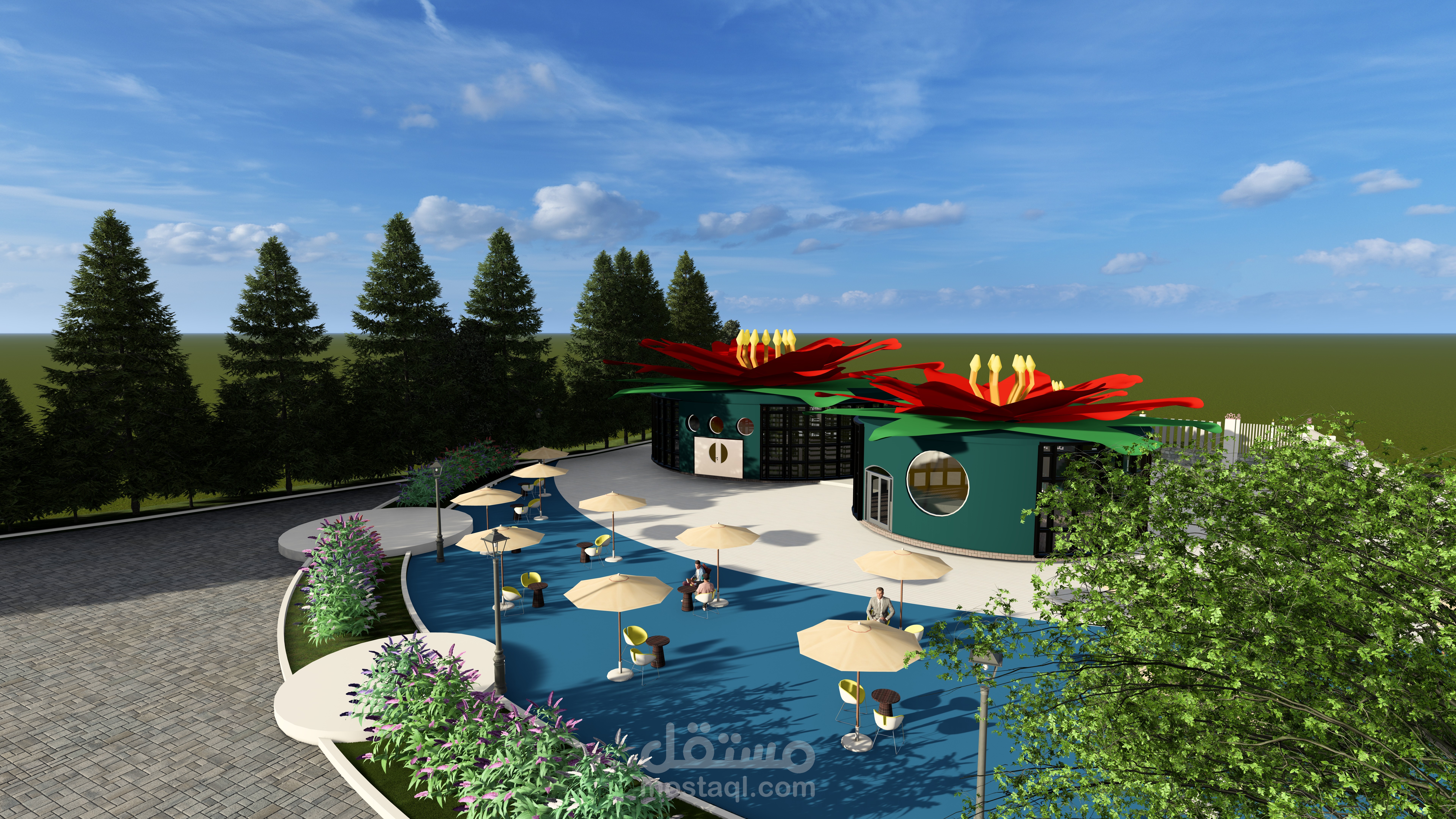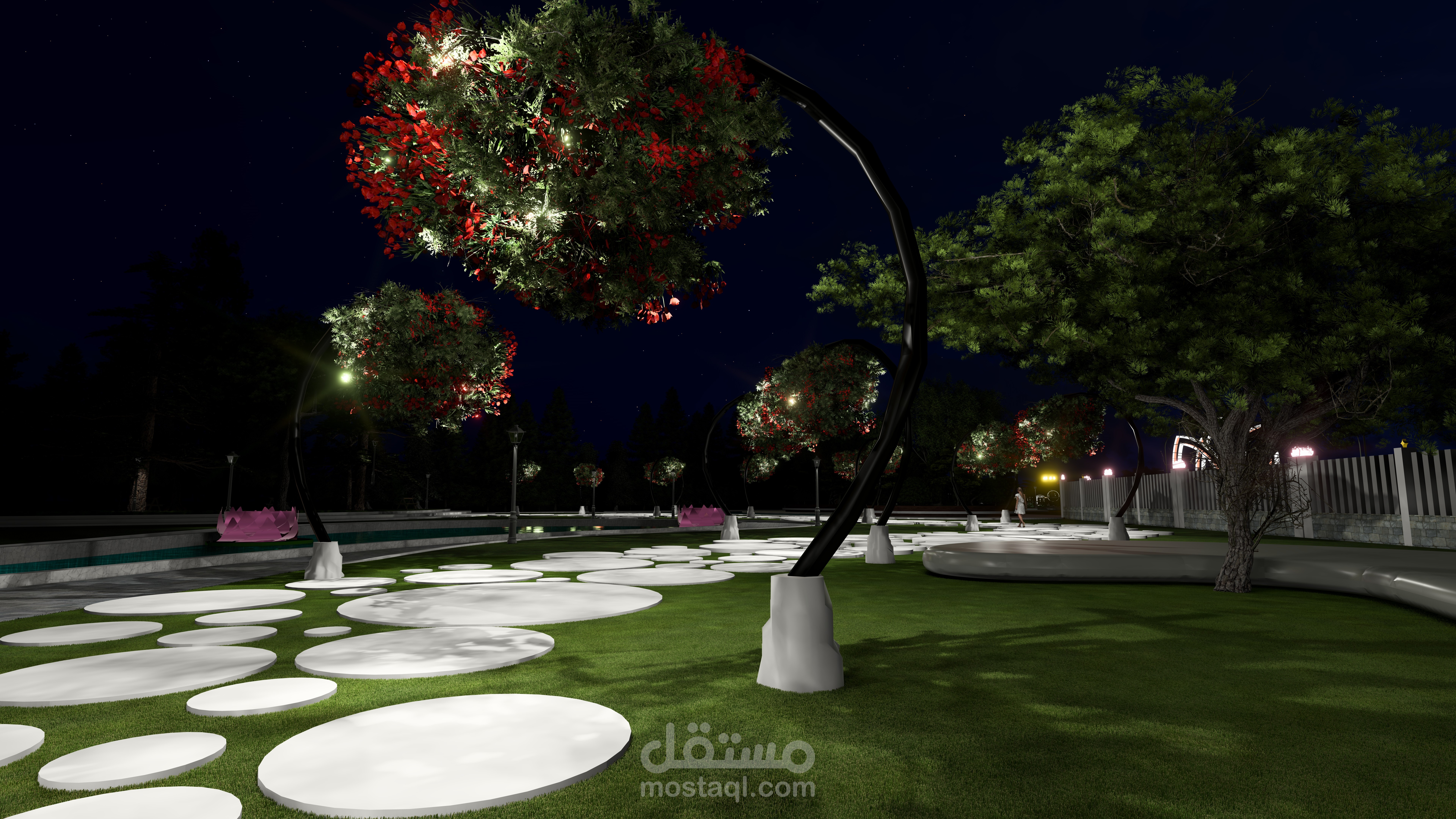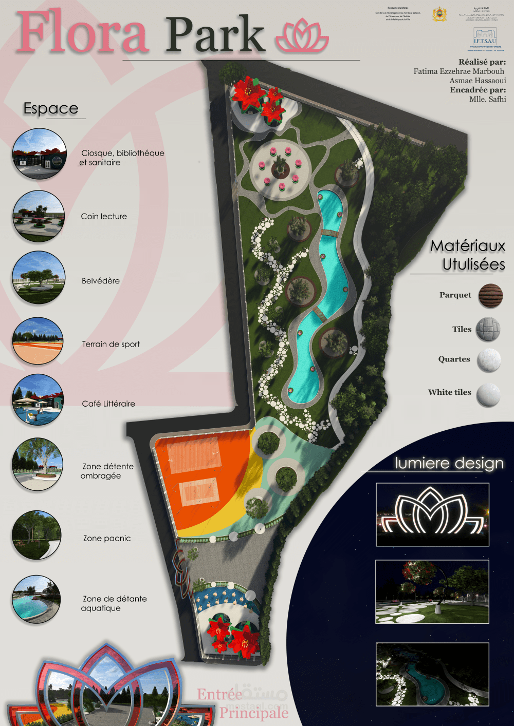 Ce projet de parc urbain, intitulé Flora Park, propose une série d’espaces thématiques conçus pour favoriser la détente, la lecture, le sport et la convivialité. Chaque zone — du belvédère au café littéraire, en passant par les coins ombragés et les installations aquatiques — a été pensée pour offrir une expérience sensorielle et sociale riche. La conception architecturale a été réalisée sur Archicad, permettant une organisation spatiale précise et cohérente. Les rendus visuels ont été produits sur Lumion, mettant en valeur l’ambiance diurne et nocturne du parc grâce à un travail soigné sur la lumière et les textures. Enfin, les éléments de mobilier urbain ont été modélisés en 3D sur AutoCAD, assurant une intégration harmonieuse entre fonctionnalité et esthétique.