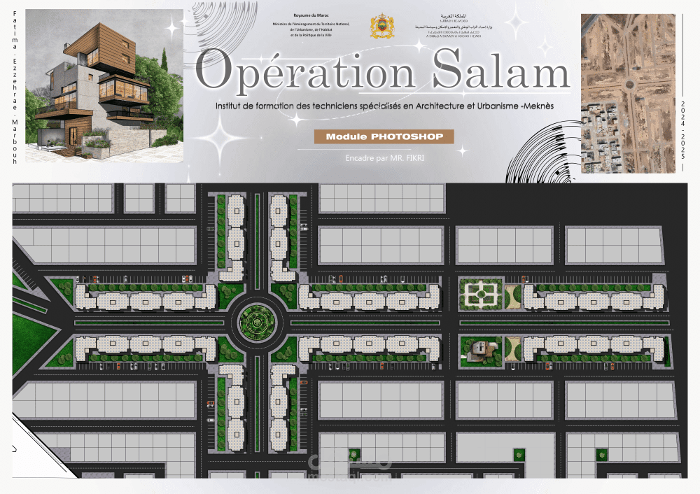 Cette fiche d’annonce immobilière a été entièrement réalisée sur Photoshop dans le cadre d’une opération de lotissement résidentiel. Elle met en valeur un projet comprenant des villas modernes, un parc central, des espaces verts soigneusement aménagés et des zones de stationnement accessibles. À travers une composition graphique équilibrée, elle présente les différentes facettes du projet : vues 3D du bâti, plan d’implantation urbaine, et éléments de branding institutionnel. L’ensemble reflète une approche visuelle soignée, pensée pour séduire les futurs acquéreurs tout en illustrant le potentiel architectural et paysager du site.