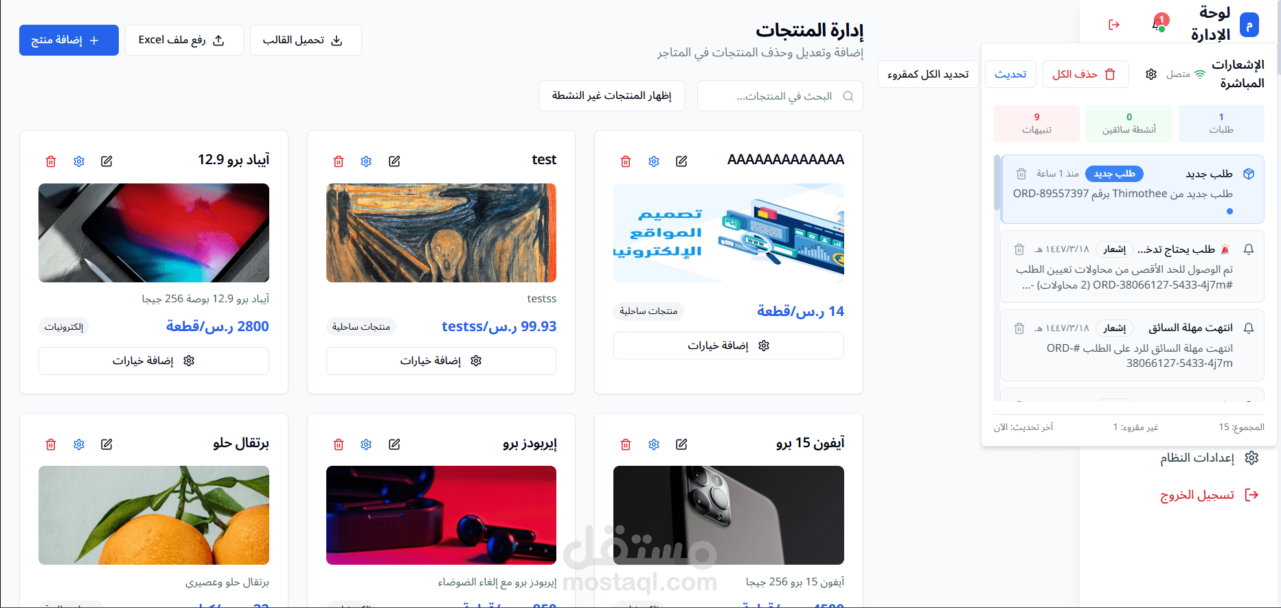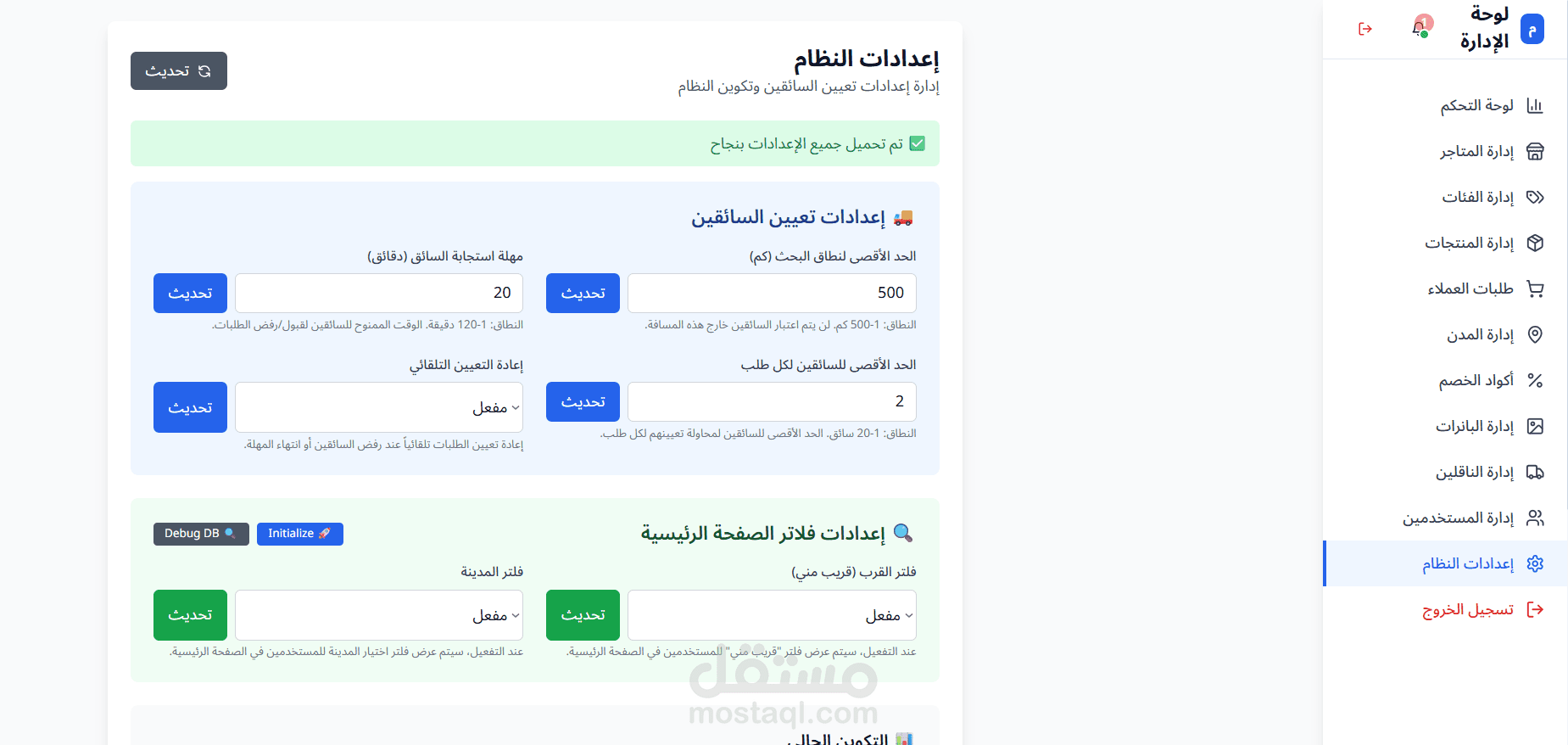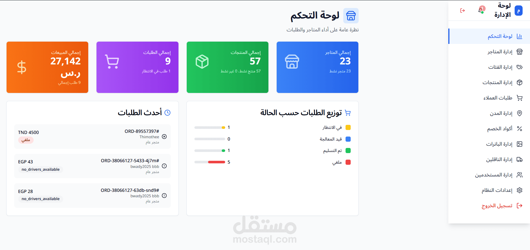 للإدارة: لوحة تحكم شاملة لإدارة المتاجر، المنتجات، الطلبات، والسائقين