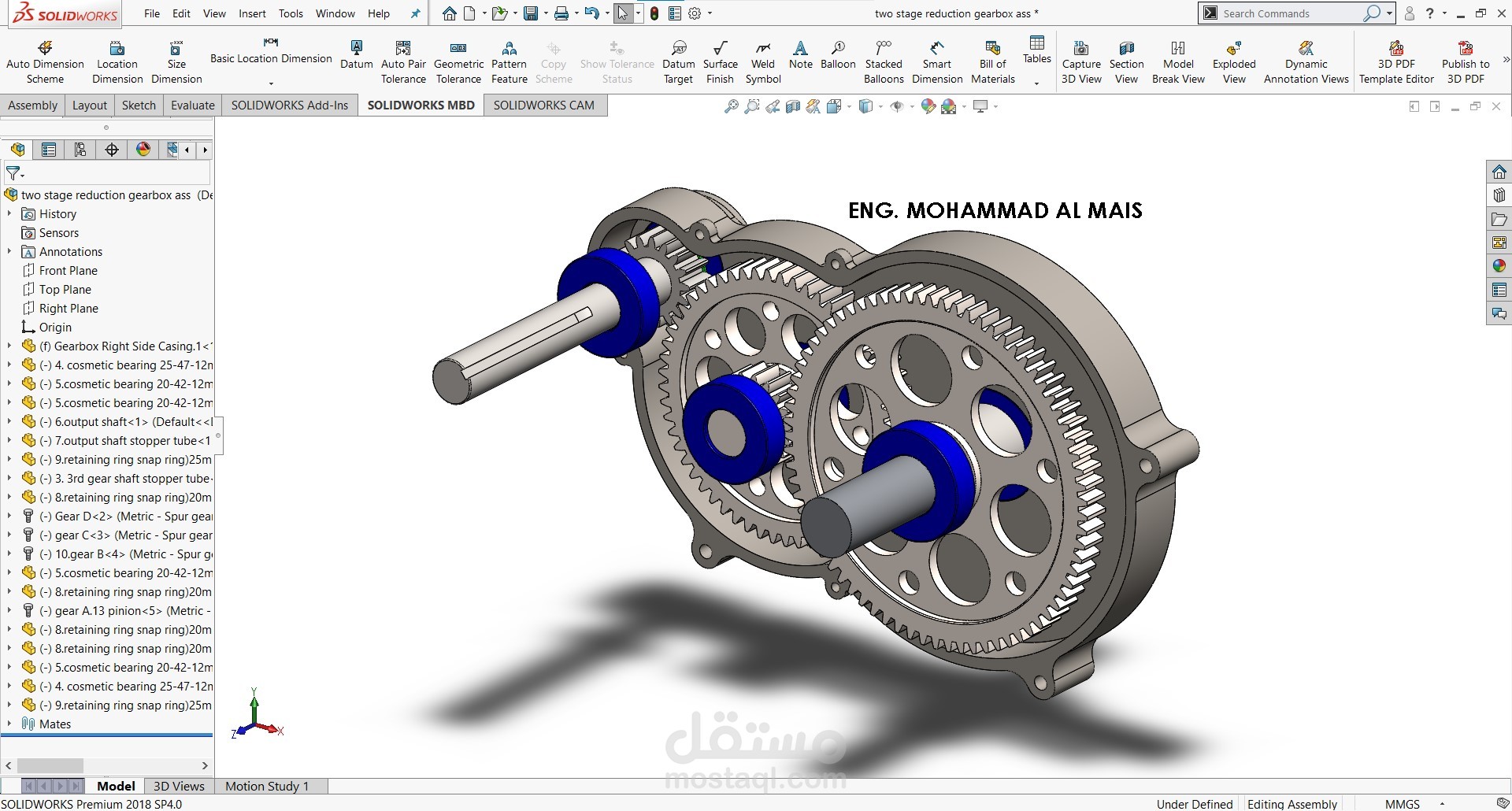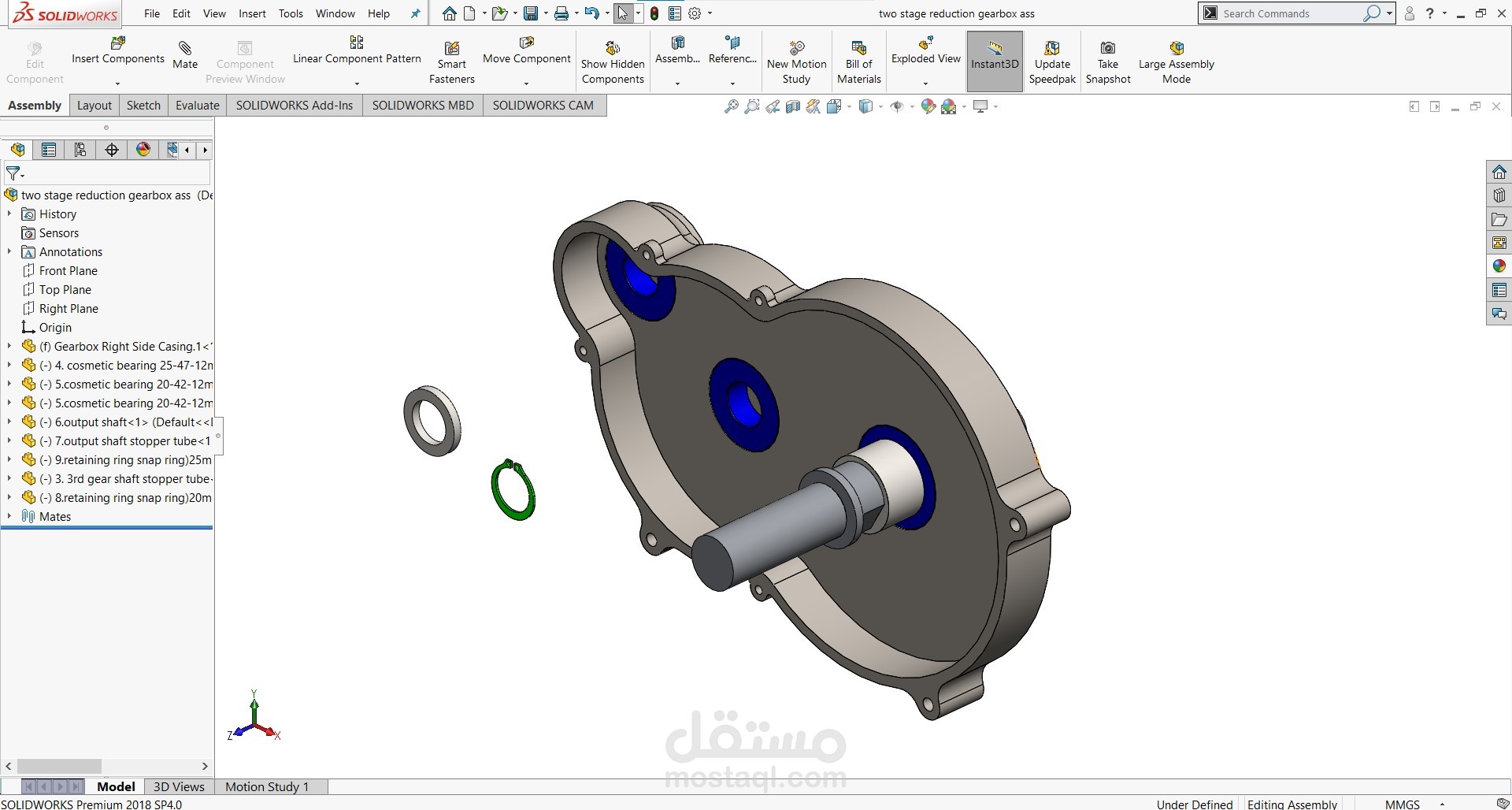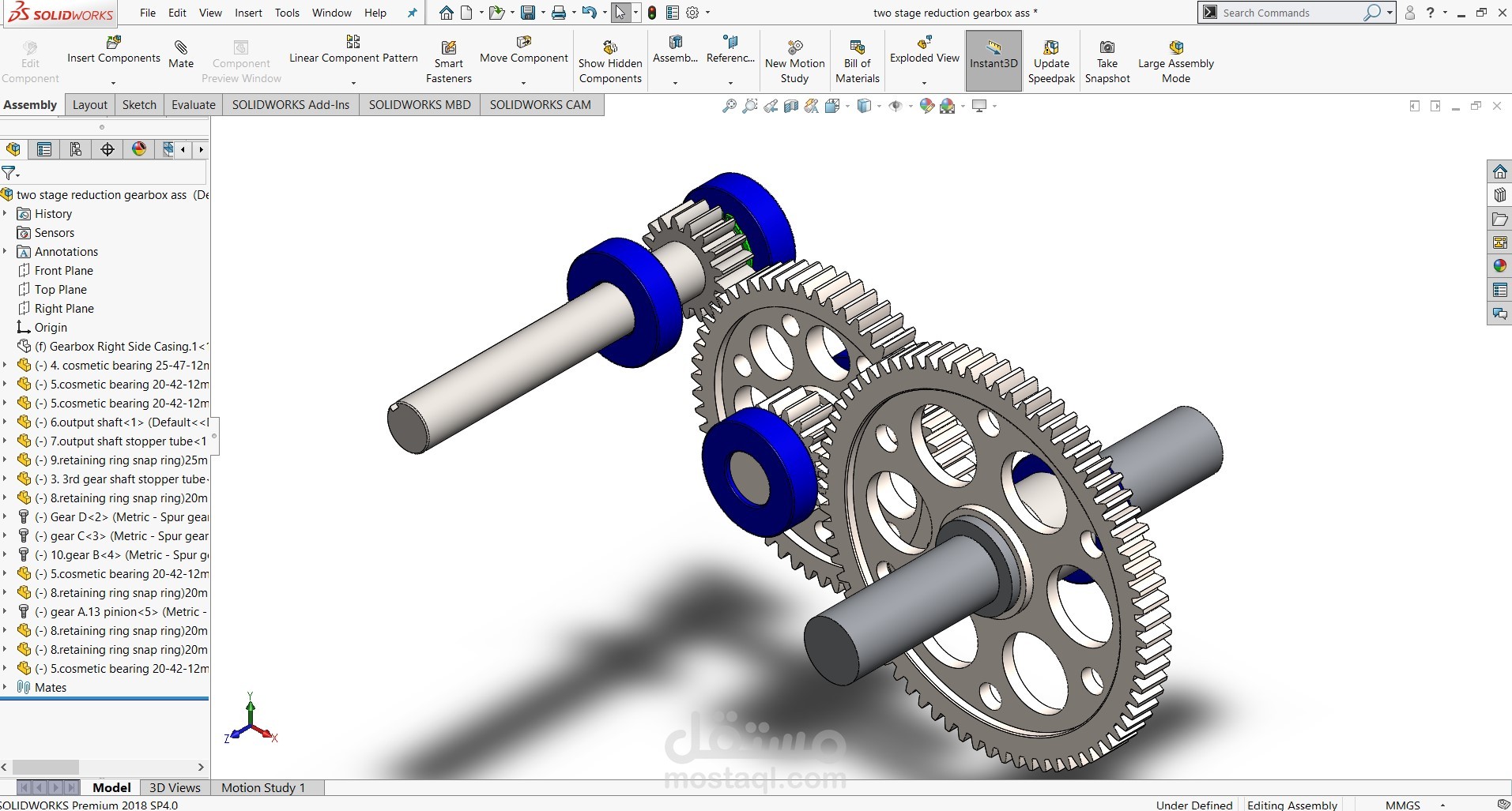 This model represents a two-stage spur gear reduction gearbox designed and assembled in SolidWorks. The gearbox consists of: