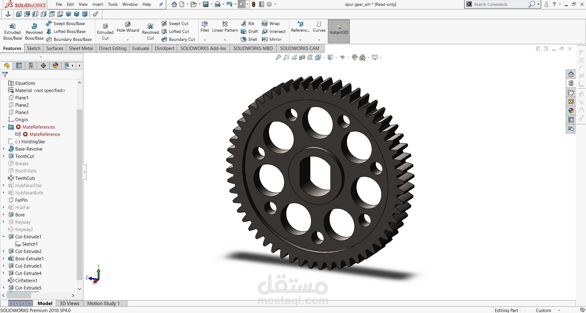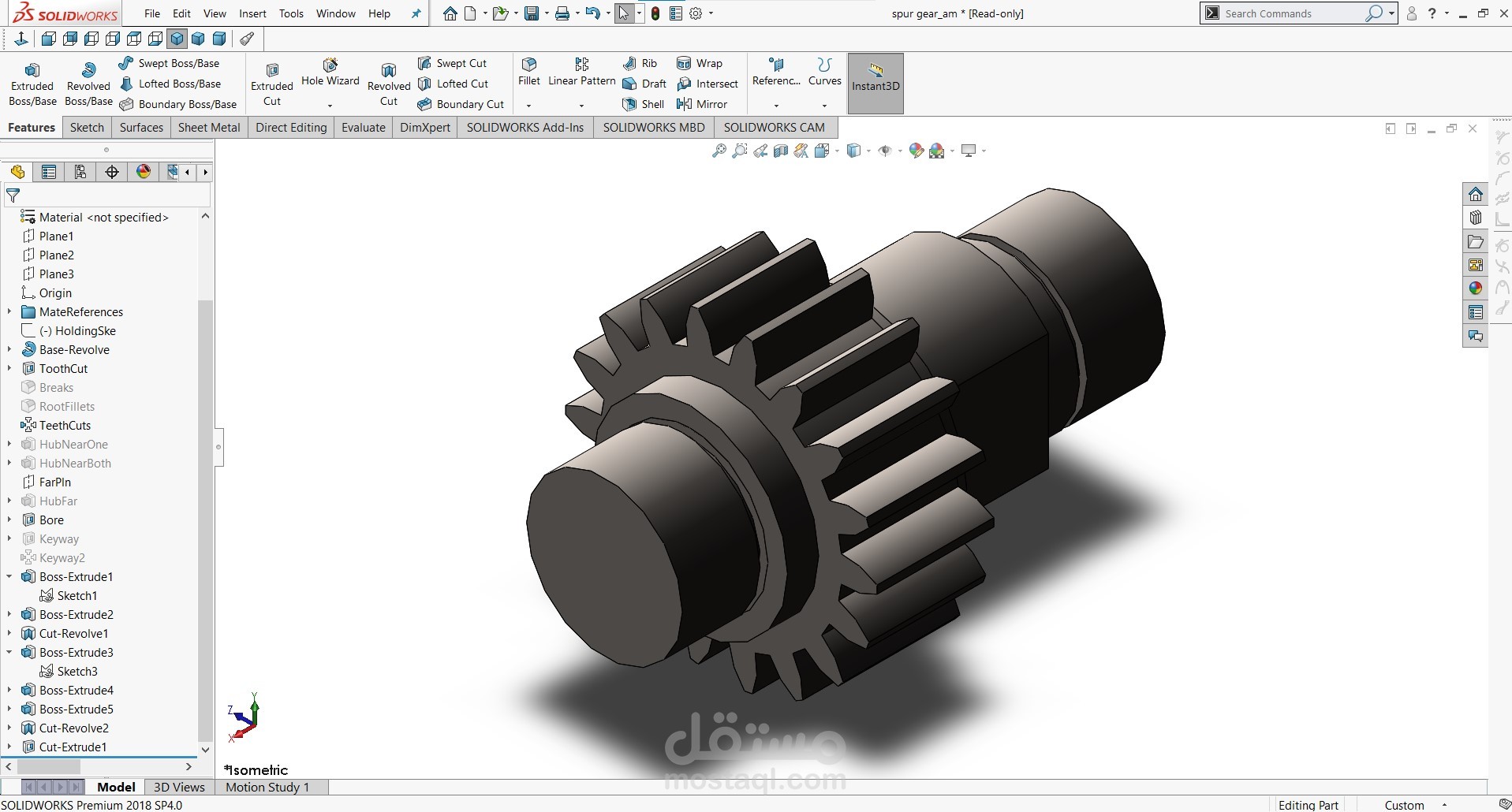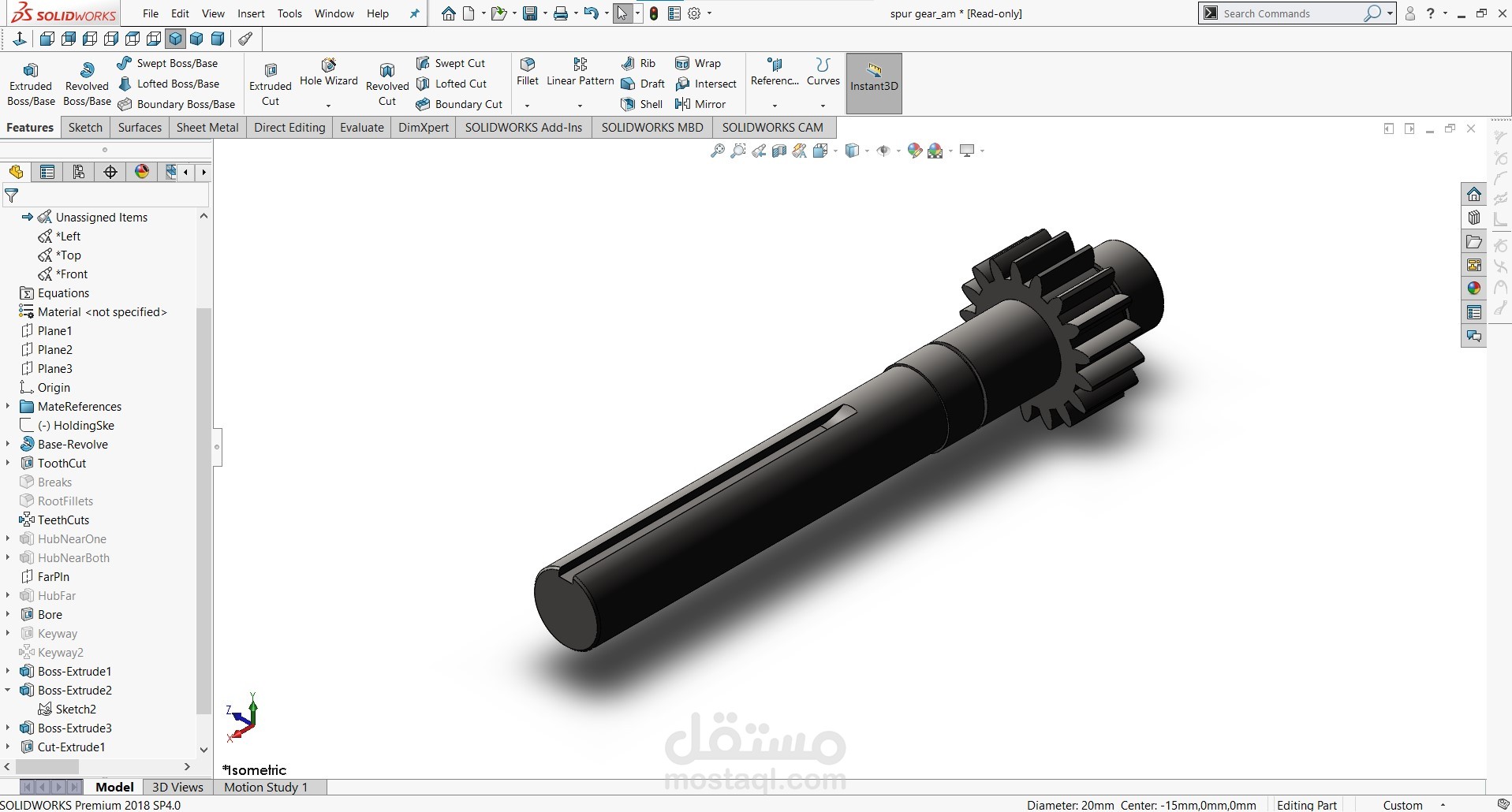 This model represents a two-stage spur gear reduction gearbox designed and assembled in SolidWorks. The gearbox consists of: