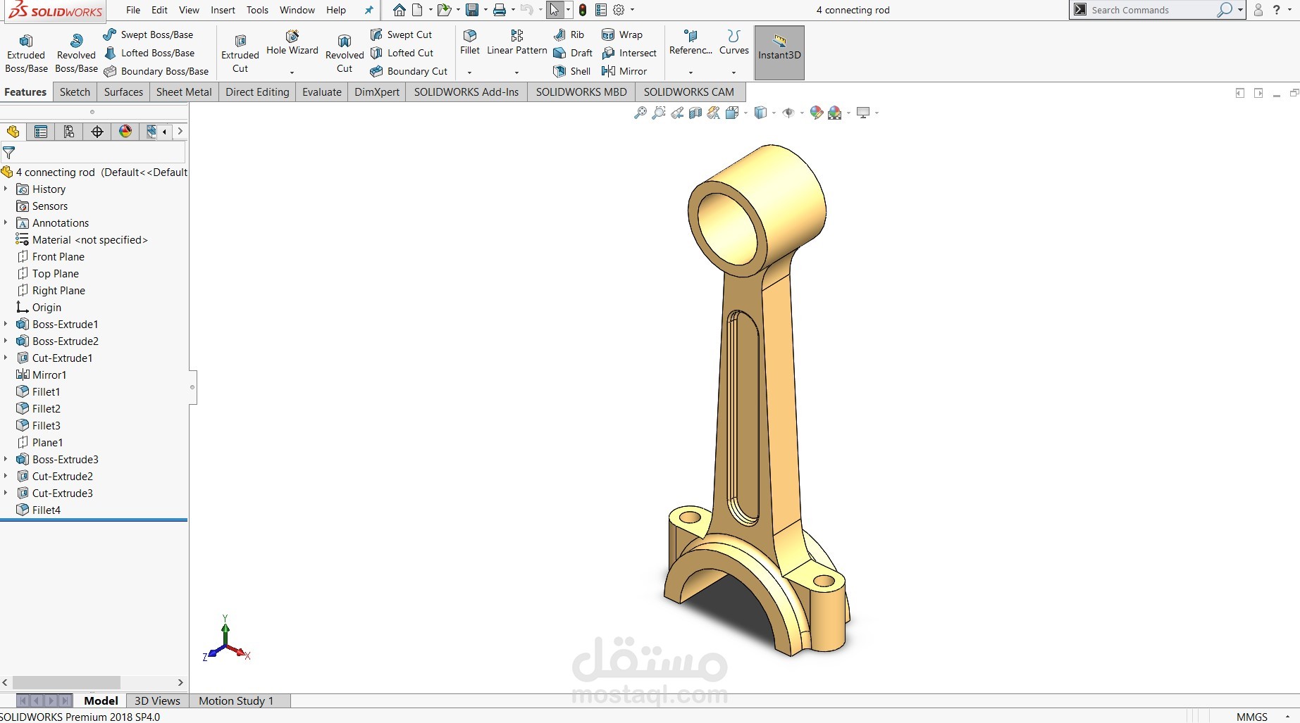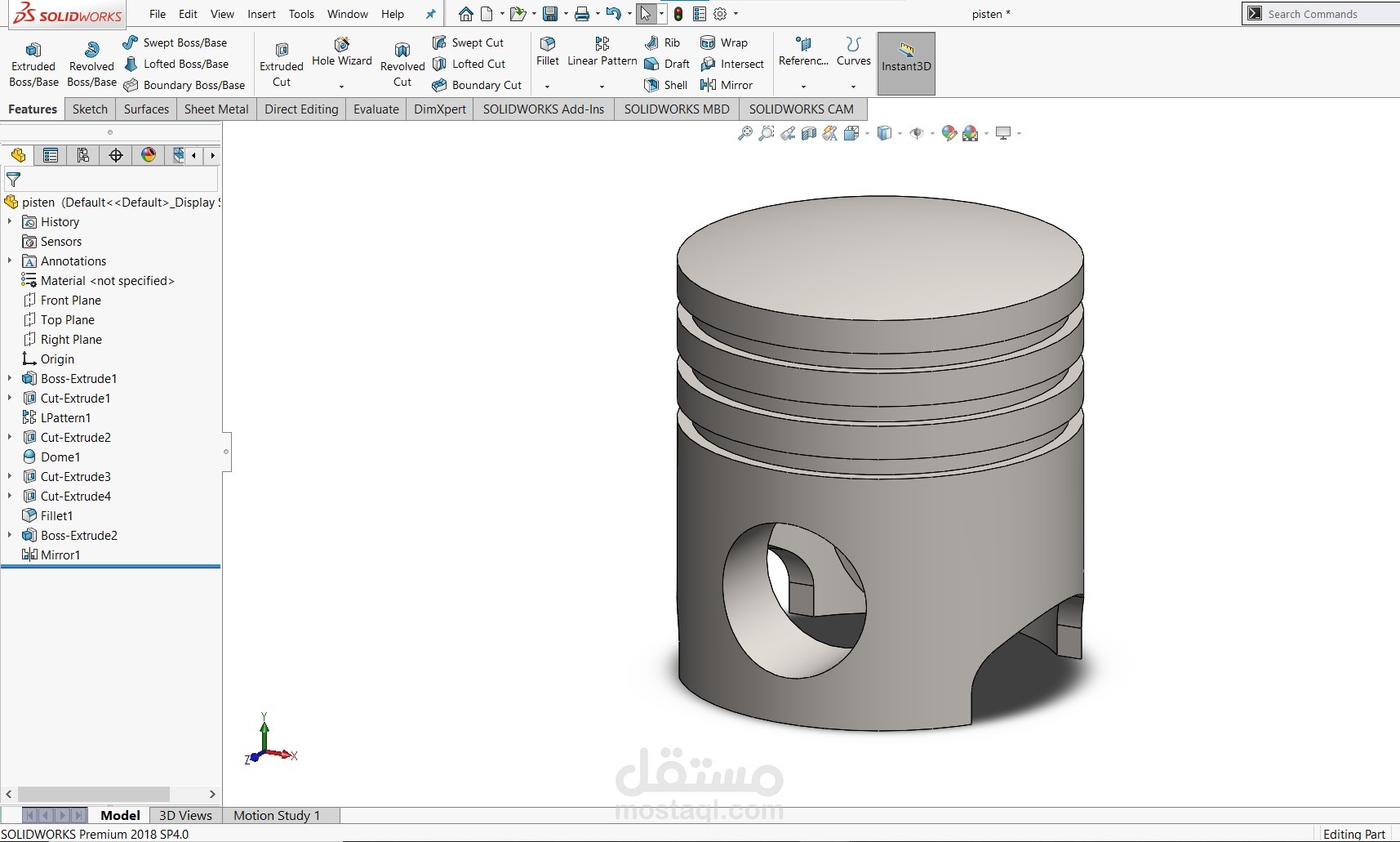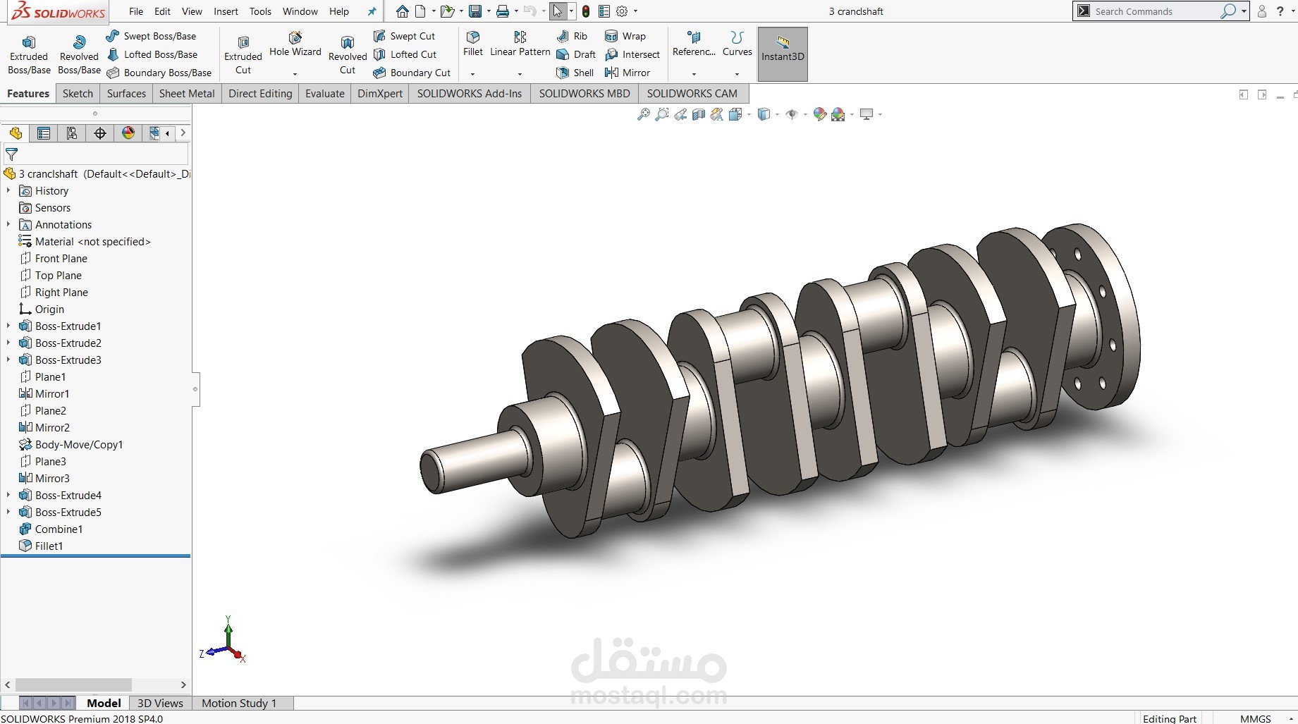 This SolidWorks model represents a four-cylinder inline engine crankshaft–piston assembly.