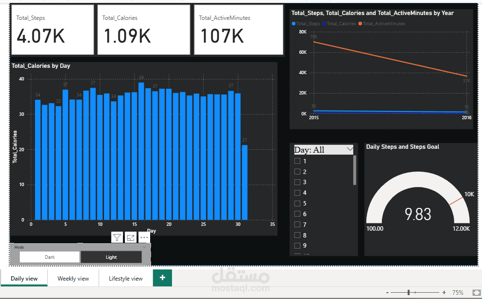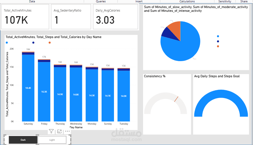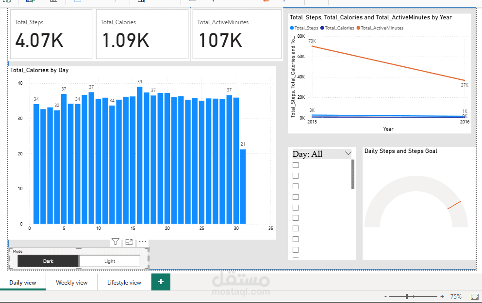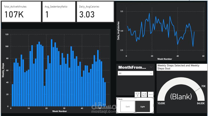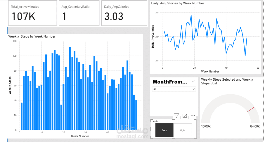 إنشاء Gauge لإجمالي الخطوات الأسبوعية مقابل الهدف.