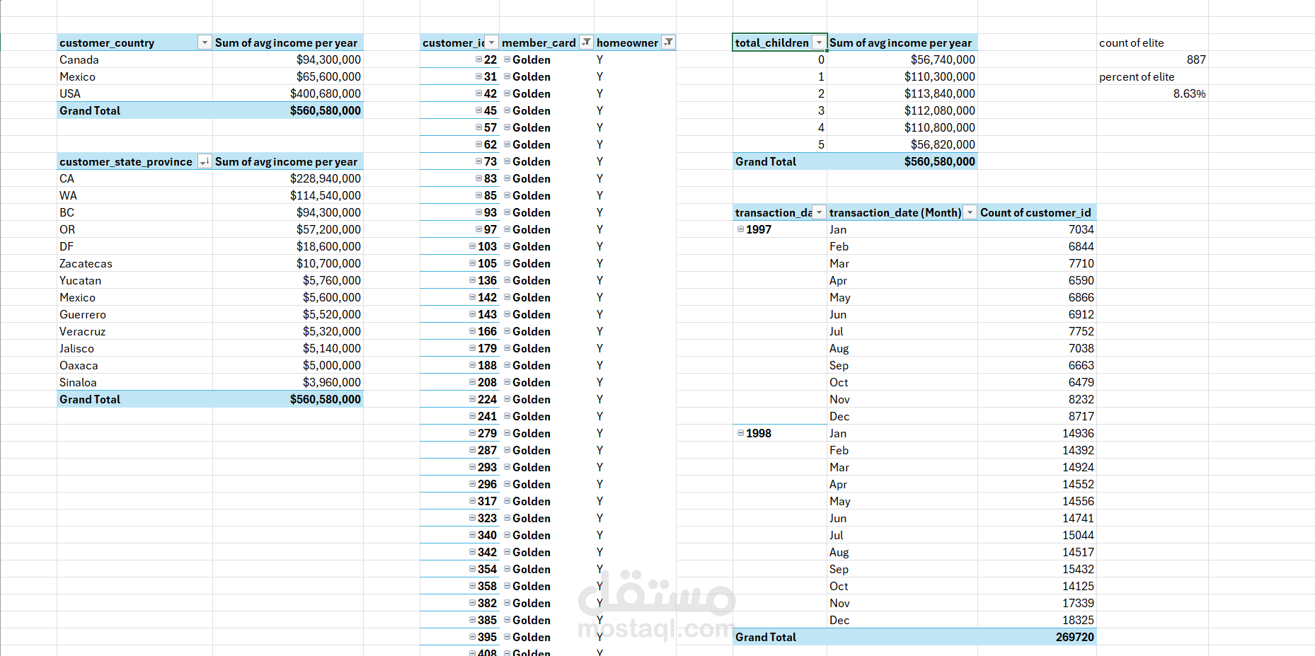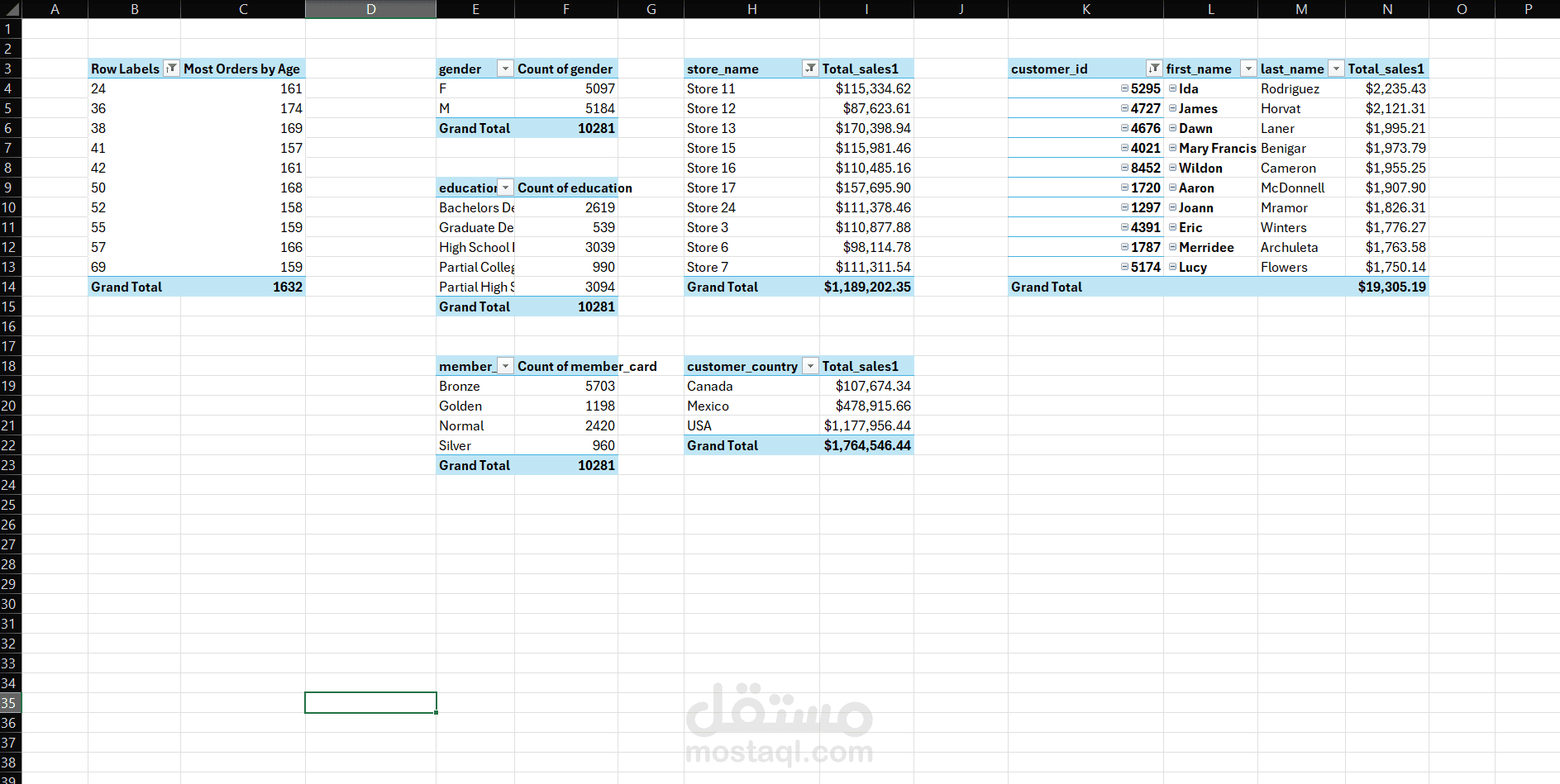 تصميم أكثر من 10 جداول PivotTables لتحليل مؤشرات الأداء الرئيسية مثل: إجمالي المبيعات، نسبة الأرباح، أفضل العملاء، أفضل المناطق، ومعدلات المرتجعات.