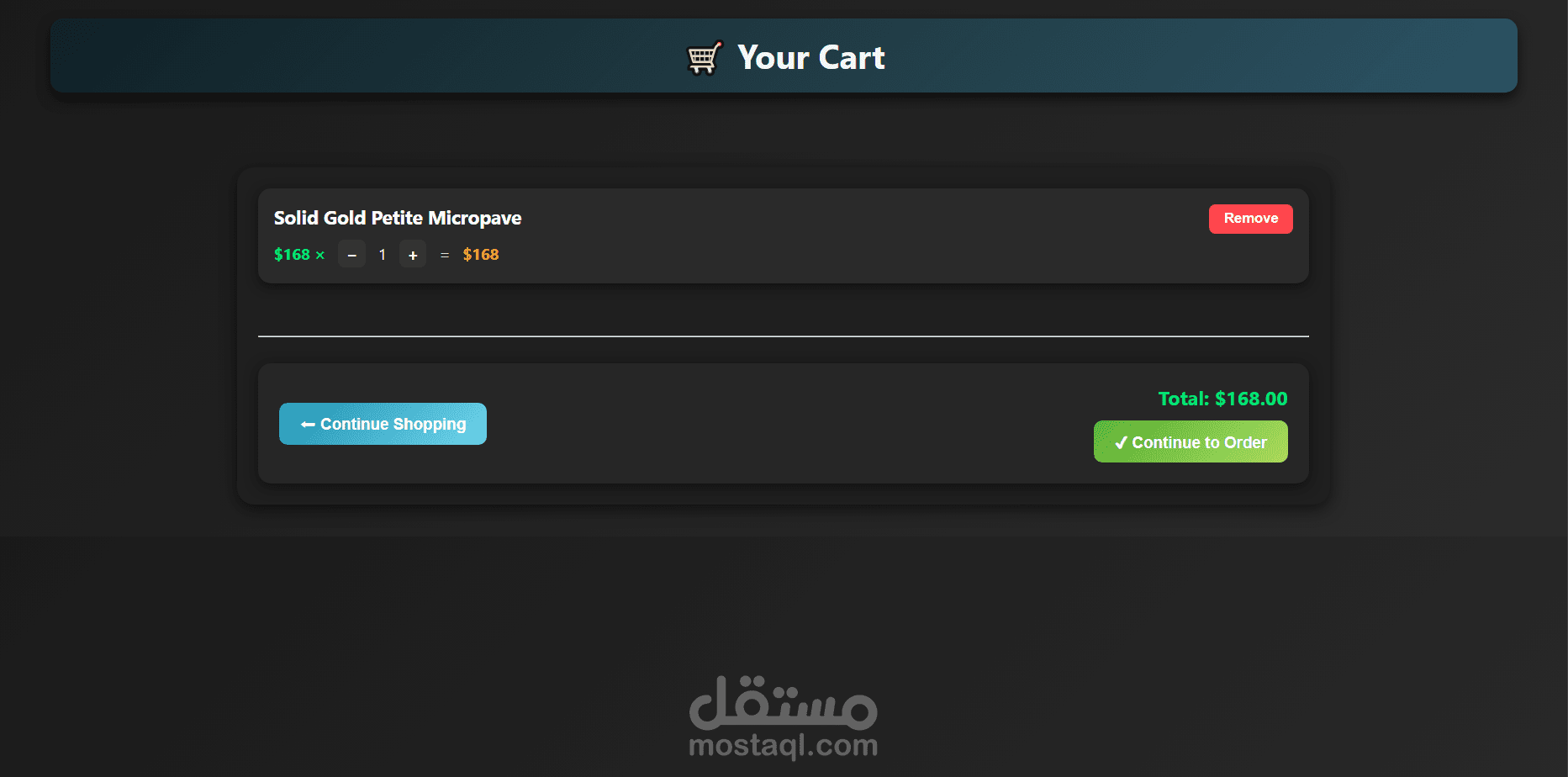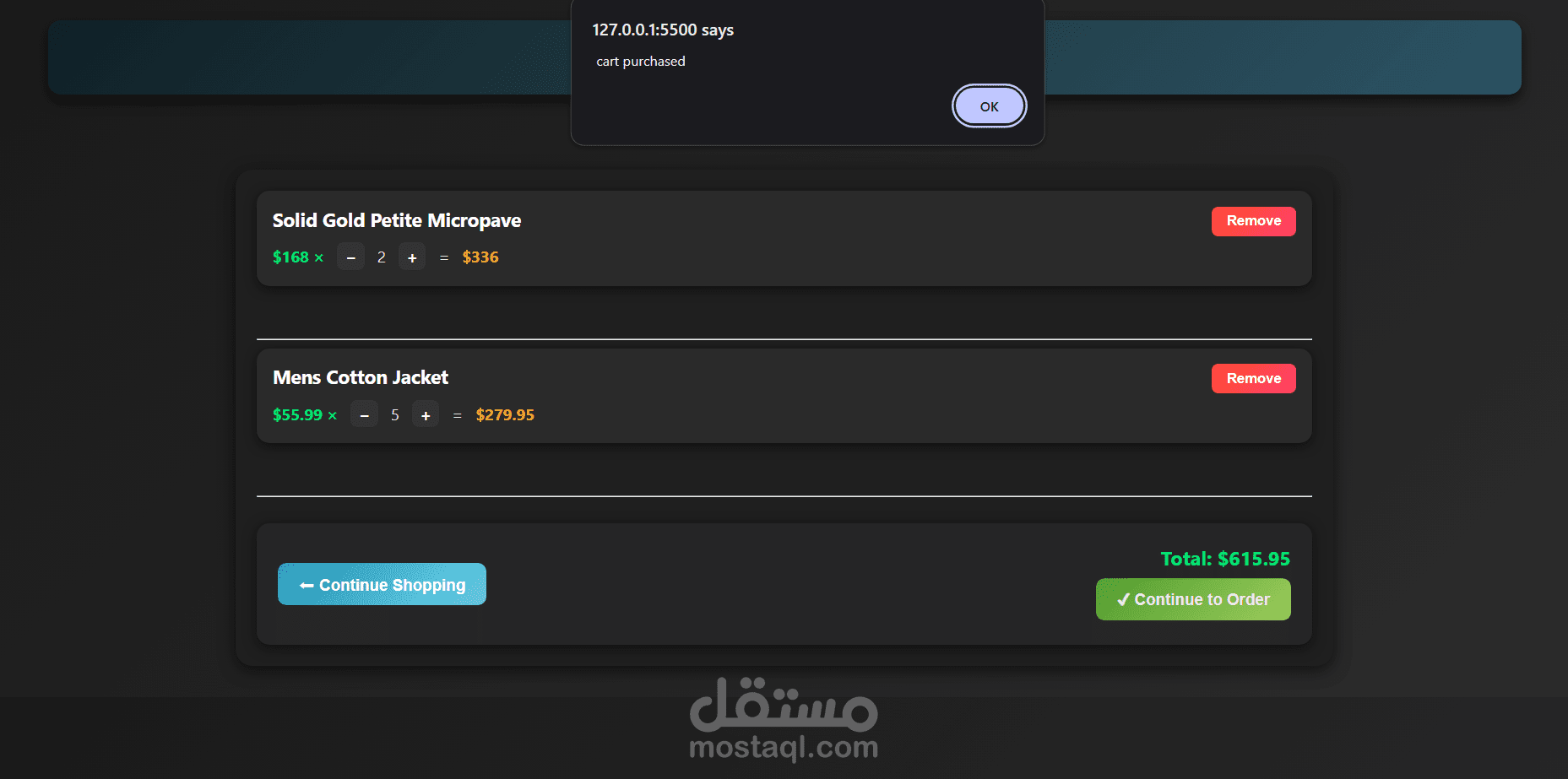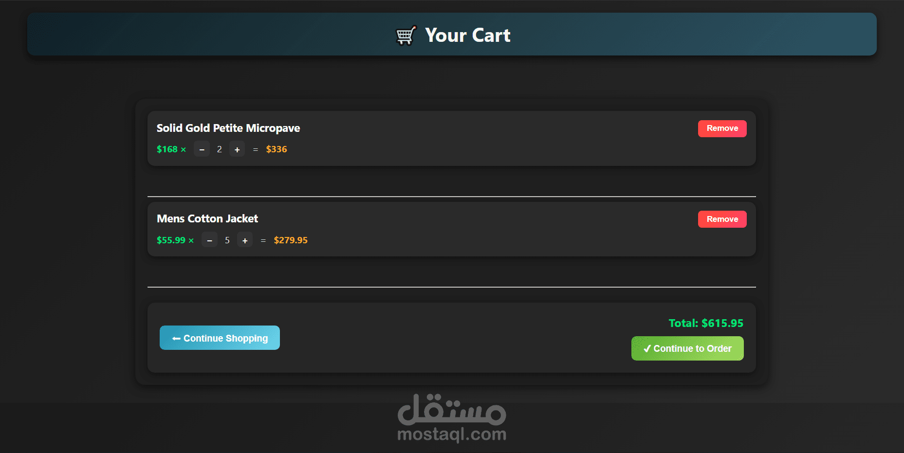 الصفحة الثانية (صفحة العربة): عند الضغط على زر "Add to Cart" يتم إضافة المنتج إلى العربة وتخزين البيانات في Local Storage، ثم يتم توجيه المستخدم تلقائيًا إلى صفحة العربة لمراجعة المنتجات التي قام باختيارها.