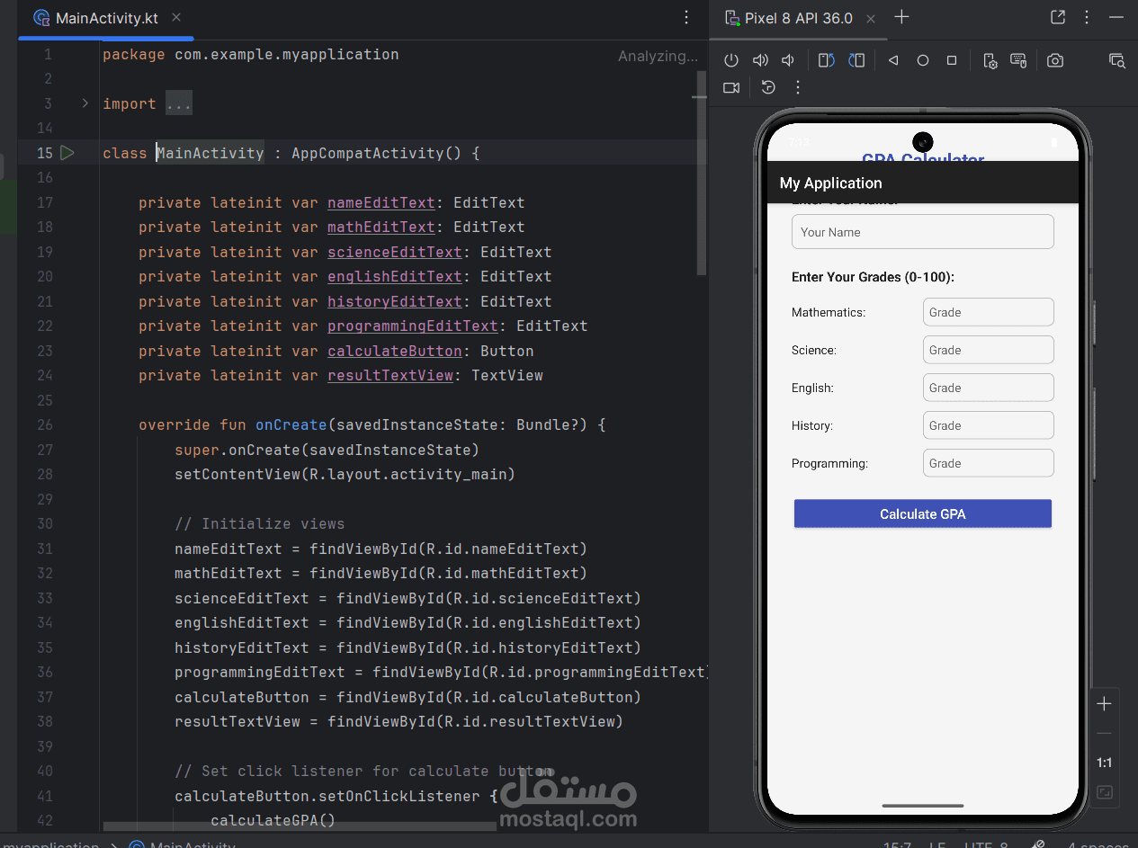 A mobile application built in Android Studio using Kotlin that allows students to calculate their Grade Point Average (GPA) quickly and accurately. The app provides an intuitive interface where users can input course names, credit hours, and grades, and it automatically computes the GPA in real time.
