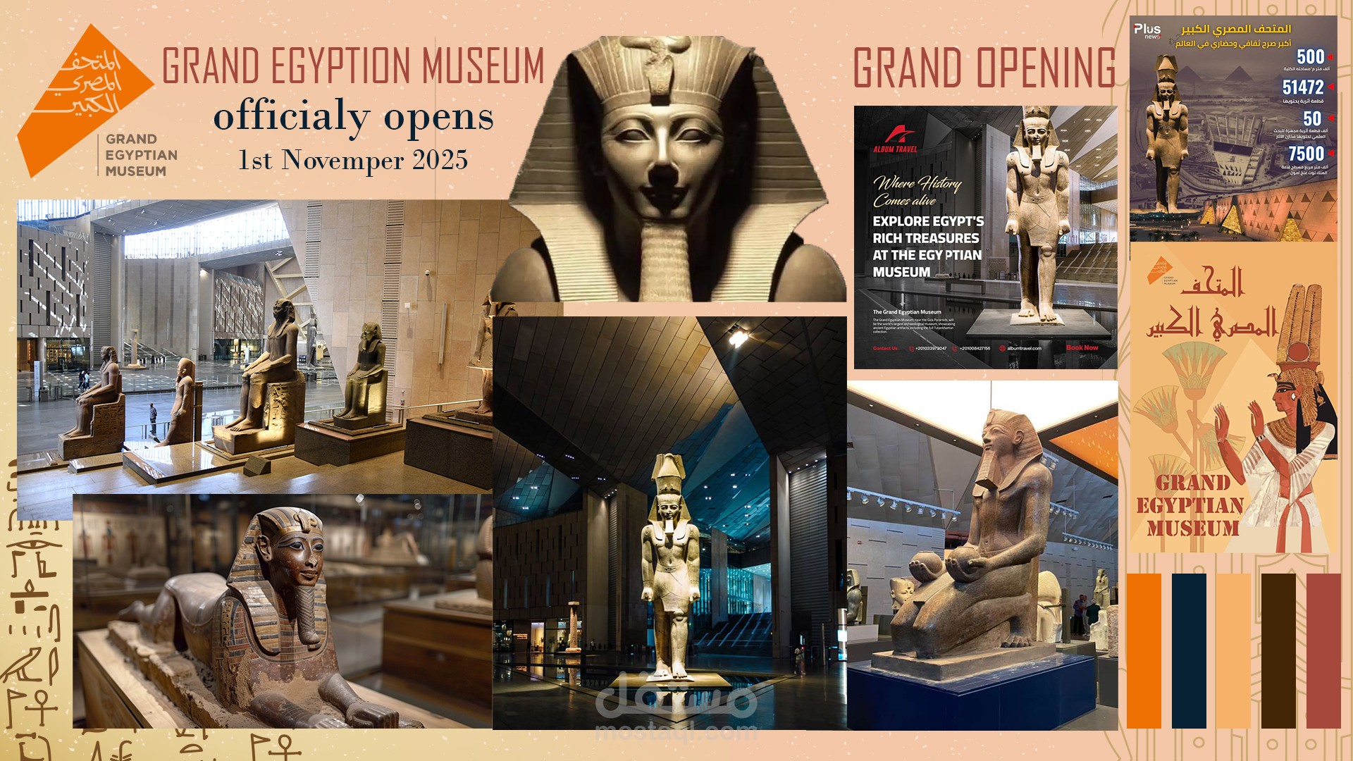تم تصميم العمل علي برنامج الفوتشوب واضافة المعلومات الخاصة بالمتحف المصري الكبير واستخدام بعض العناصر الاثرية الموجود بالمتحف المصري الكبير لاعطاء طبع المصداقية للتصميم