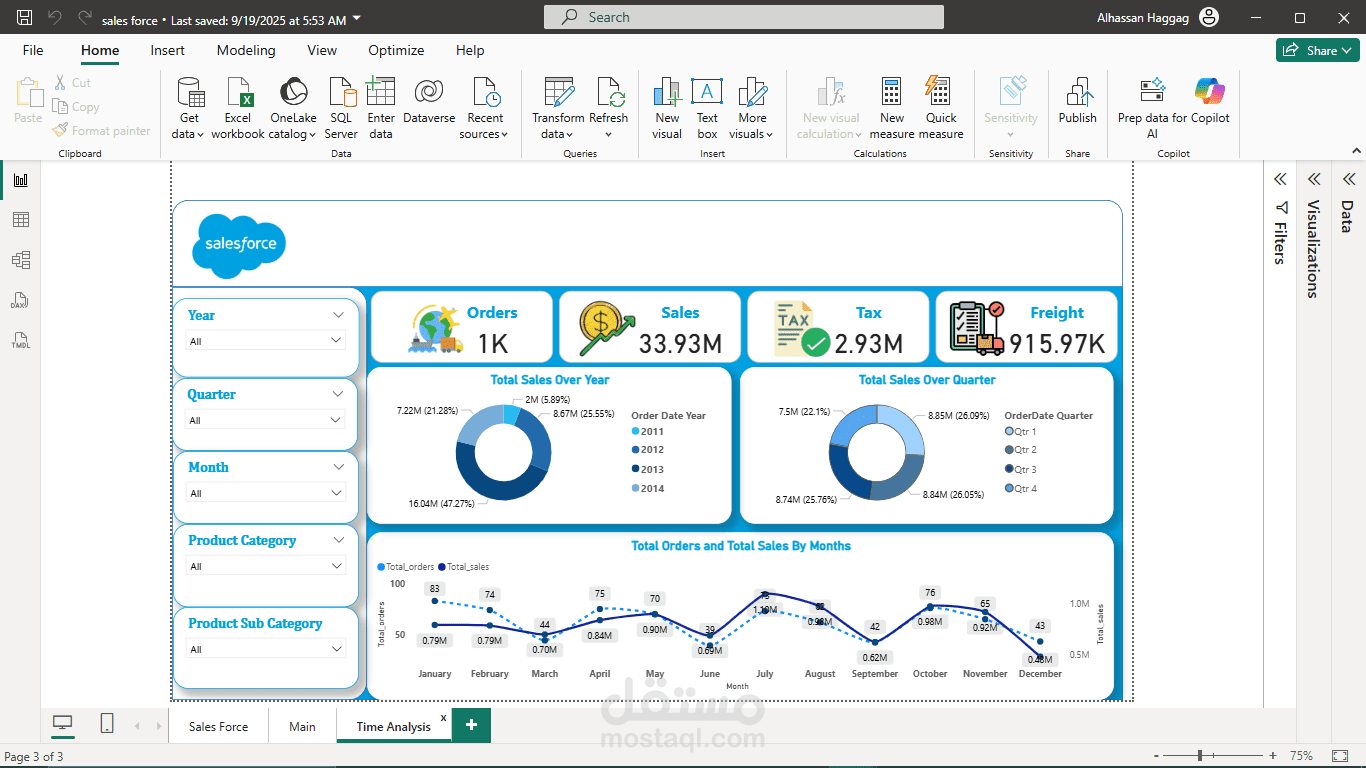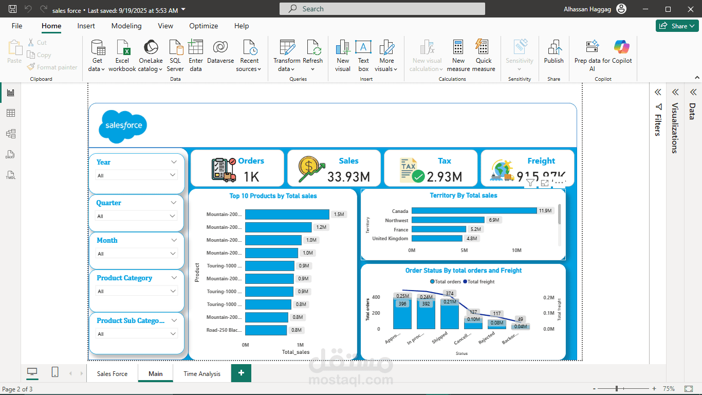 مشروع تحليل ومتابعة بيانات المبيعات لشركة باستخدام Power BI يهدف إلى تحويل بيانات المبيعات الخام المستخرجة من Salesforce إلى تقارير ولوحات تحكم تفاعلية تساعد في اتخاذ قرارات استراتيجية مستنيرة.