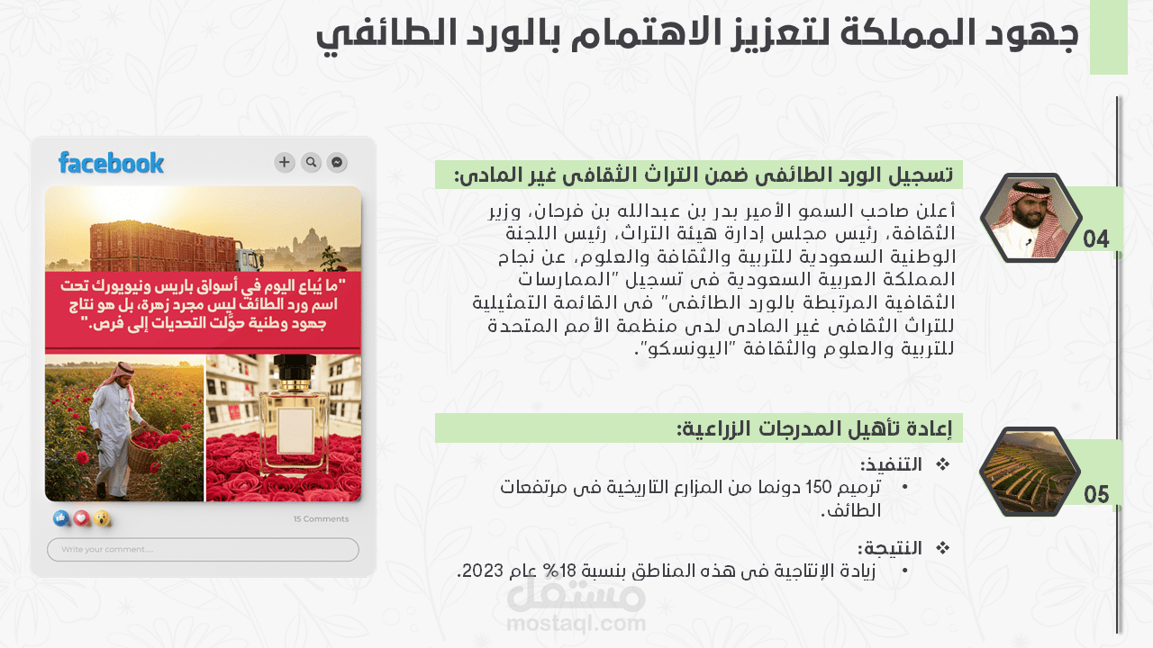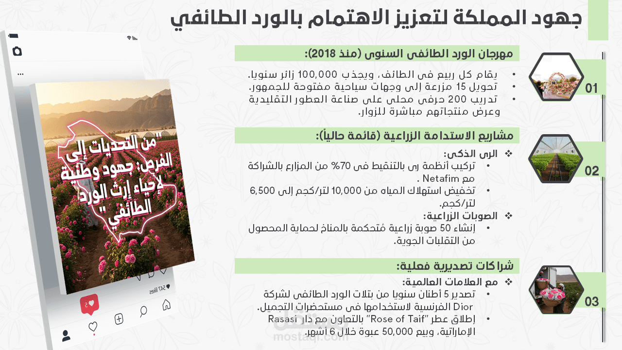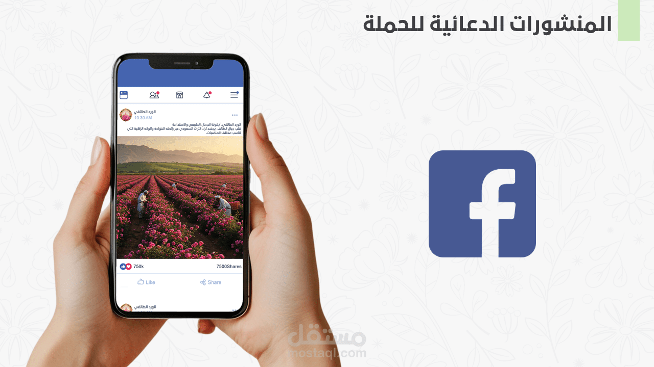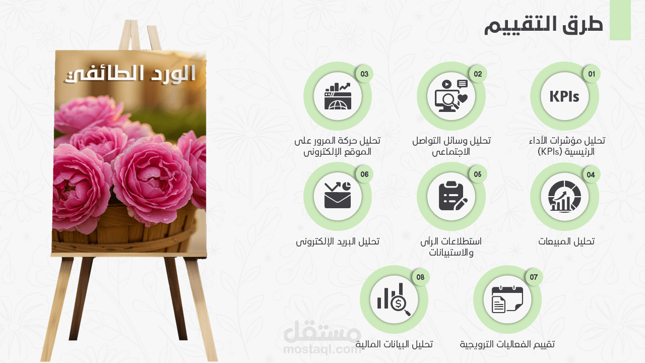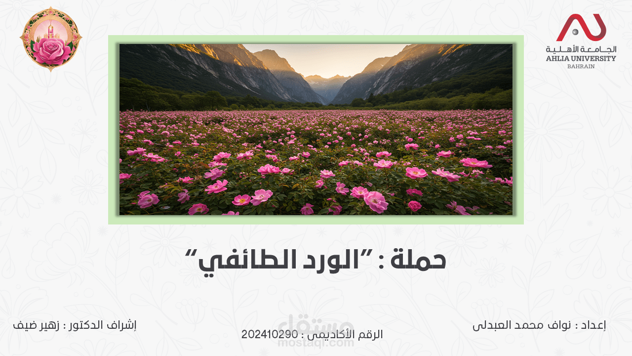 عرض تقديمي صممته للترويج لحملة الورد الطائفي، يجمع بين الهوية البصرية الأنيقة والرسائل التسويقية المؤثرة. ركزت فيه على إبراز قيمة الورد الطائفي كرمز للأصالة والجمال، مع تصميم شرائح جذابة تعكس روح الحملة وتشد انتباه الجمهور.