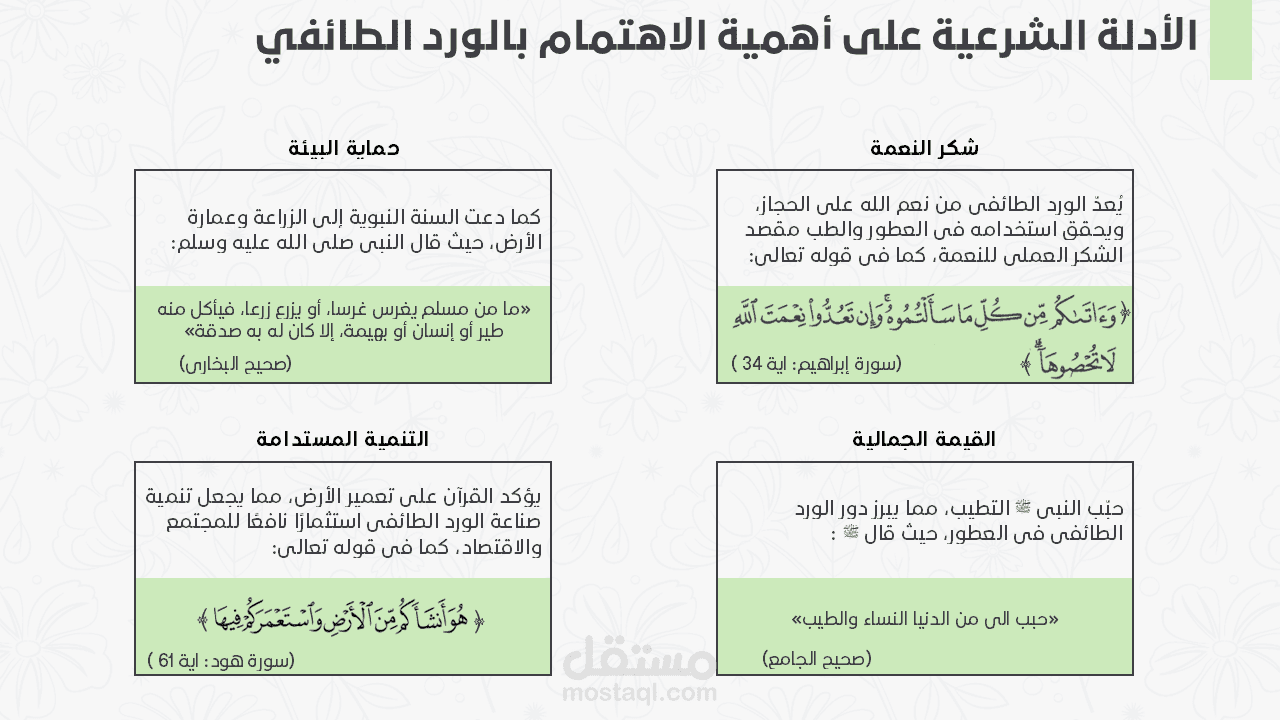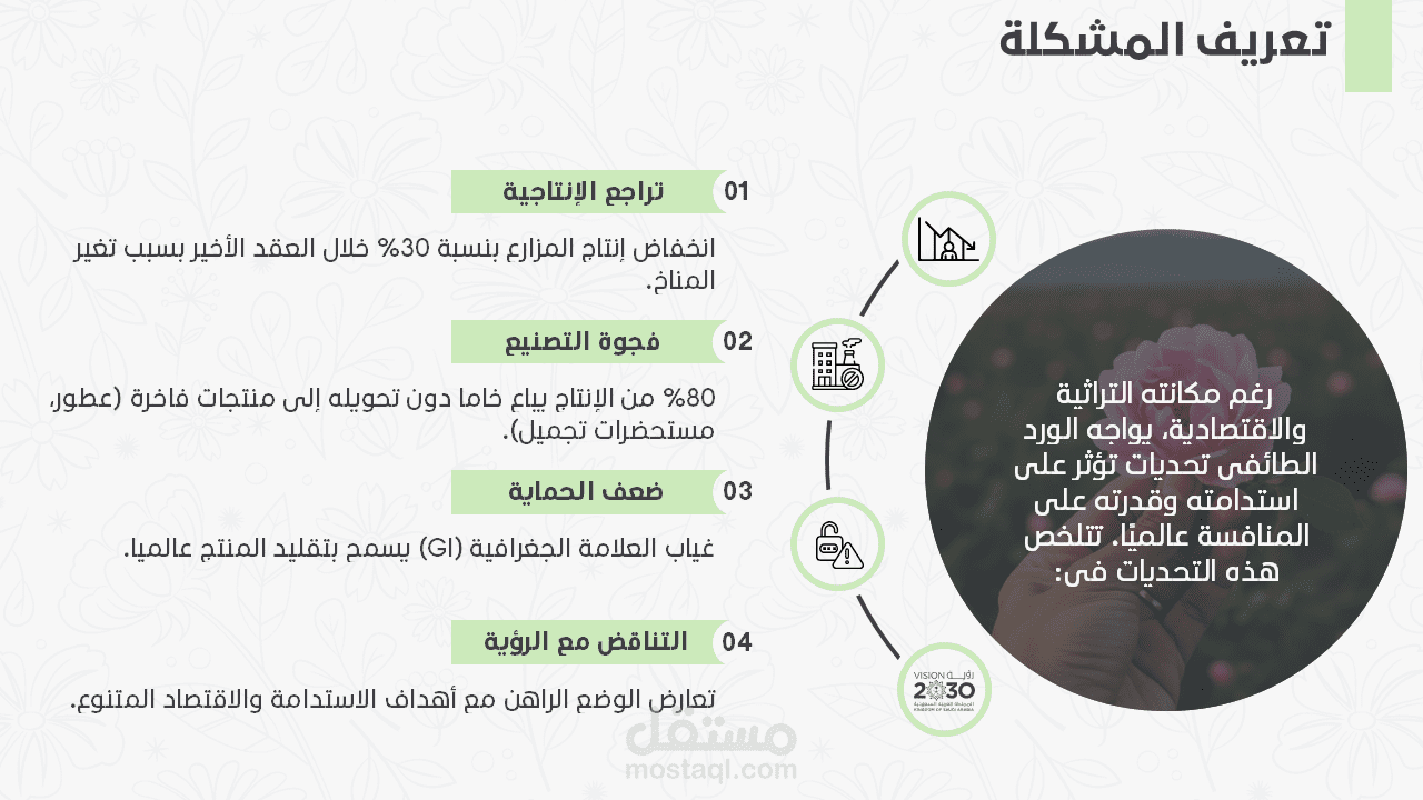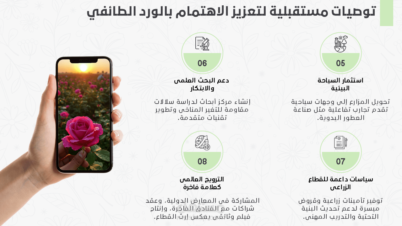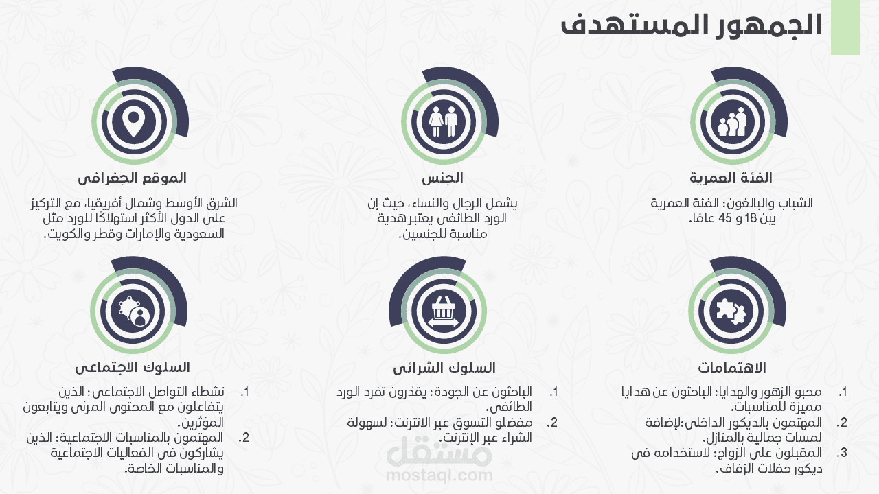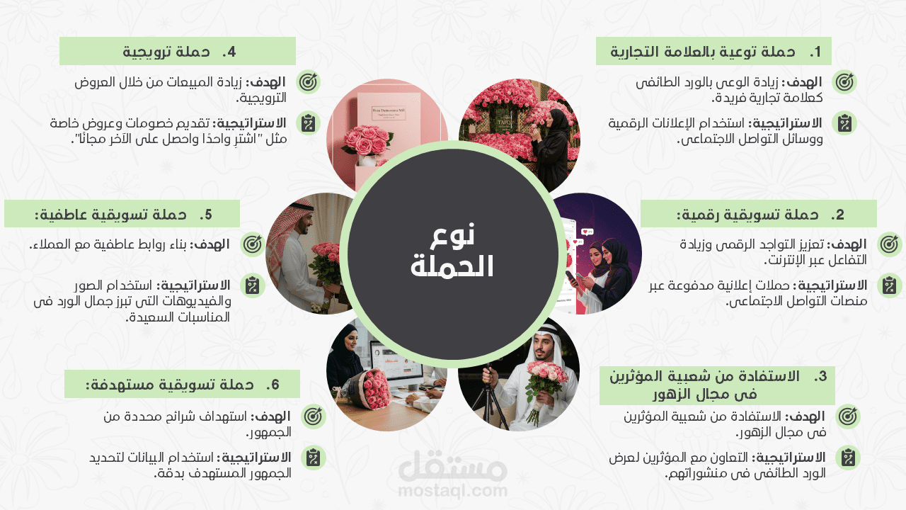 عرض تقديمي صممته للترويج لحملة الورد الطائفي، يجمع بين الهوية البصرية الأنيقة والرسائل التسويقية المؤثرة. ركزت فيه على إبراز قيمة الورد الطائفي كرمز للأصالة والجمال، مع تصميم شرائح جذابة تعكس روح الحملة وتشد انتباه الجمهور.