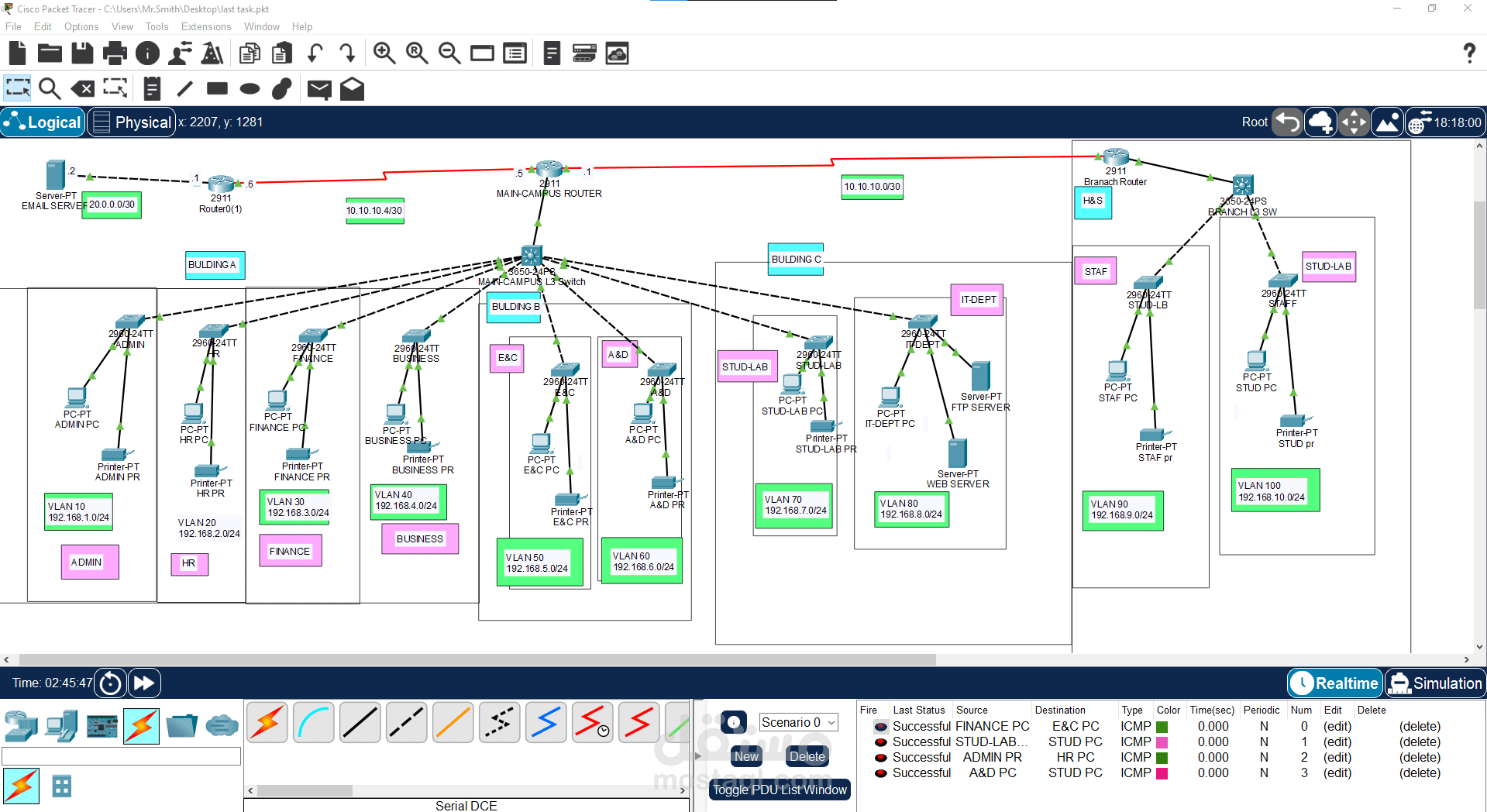 Routing Protocol: Configured RIP Version 2 for dynamic routing between buildings and the mail server router.