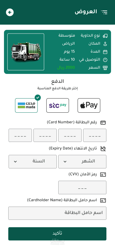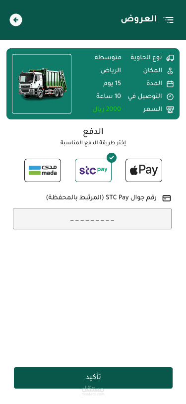 اختيار نوع الحاوية (الحجم والسعر) + مدة الإيجار