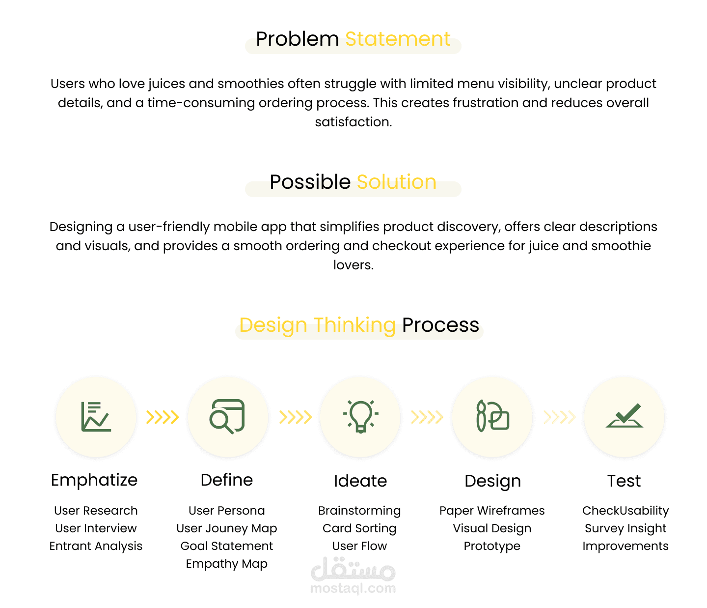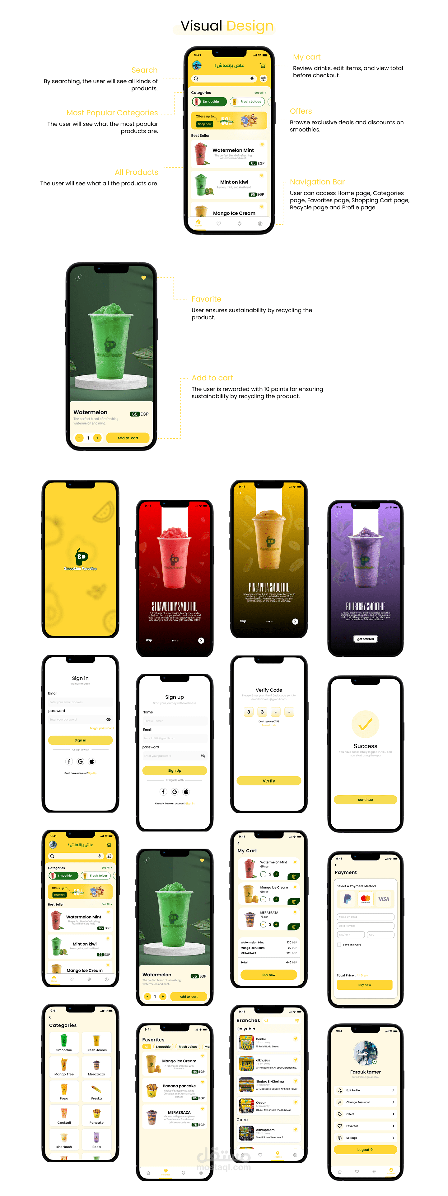 تطبيق سموزي هو تطبيق موبايل يتيح للمستخدمين استكشاف وصفات عصائر طبيعية وصحية، مع إمكانية تخصيص المكونات حسب رغباتهم. الهدف من التصميم هو توفير تجربة استخدام سلسة وبسيطة مع واجهة حديثة وجذابة تشجع المستخدمين على اتباع نمط حياة صحي