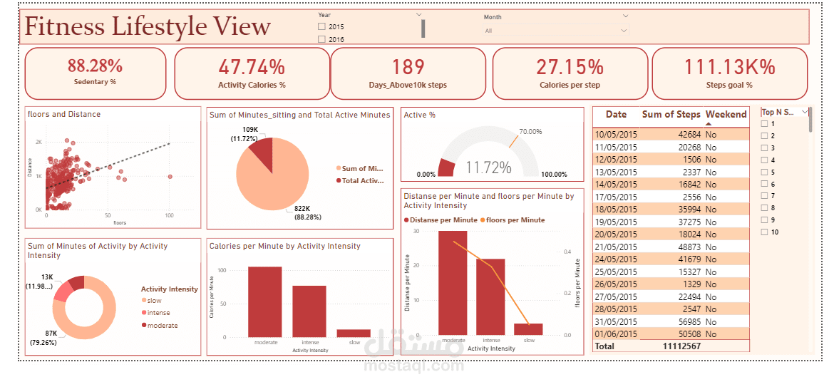 الداشبورد بتقدم تحليل شامل لبيانات النشاط البدني بهدف تتبع الأداء الصحي والرياضي بشكل تفاعلي. من خلال واجهة سهلة الاستخدام، بتعرض مؤشرات رئيسية مثل إجمالي الخطوات، الدقائق النشطة، والسعرات الحرارية المحروقة. كمان بتوضح التغيرات على مستوى اليومي، الأسبوعي، والشهري، مع تقسيم النشاط حسب شدته (خفيف – متوسط – عالي).