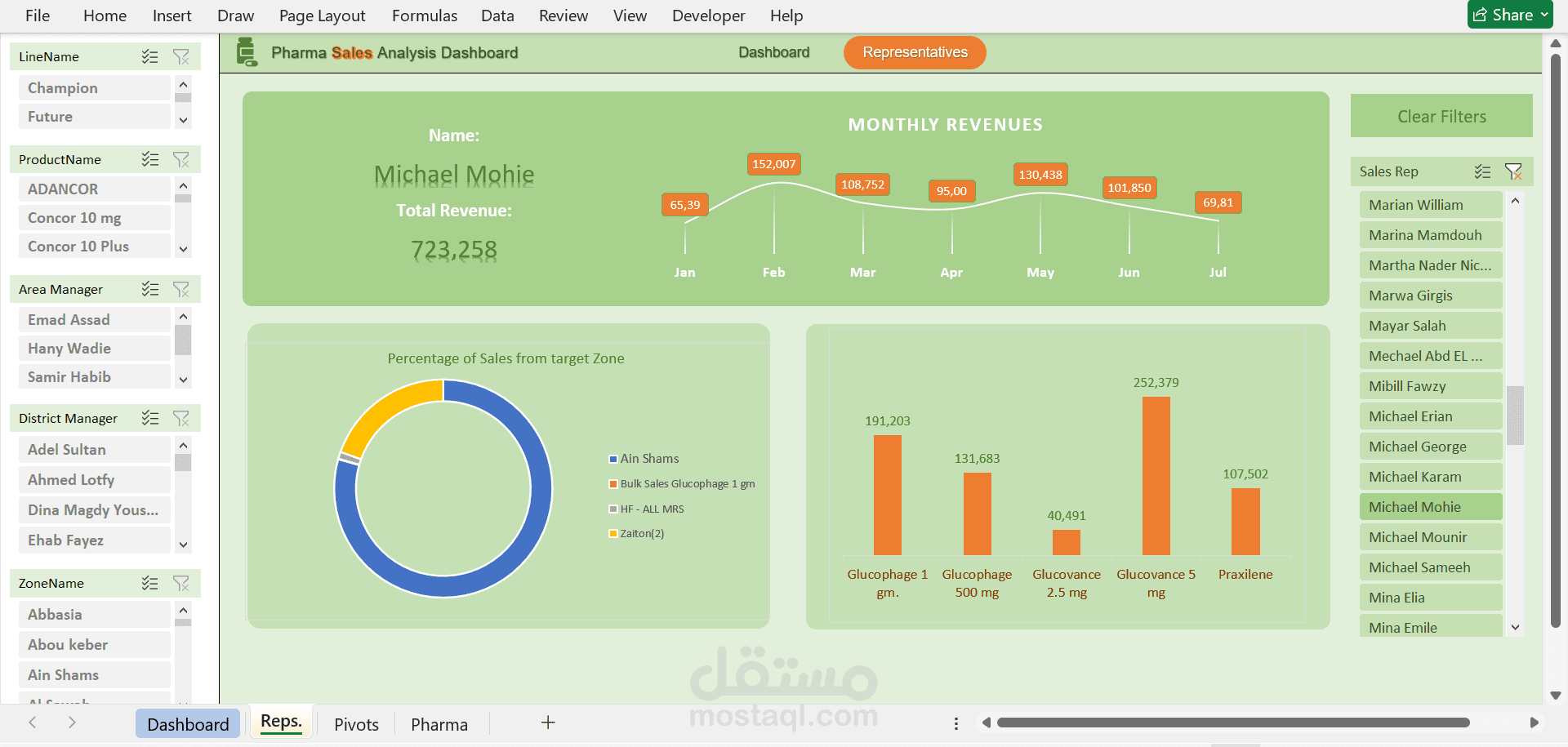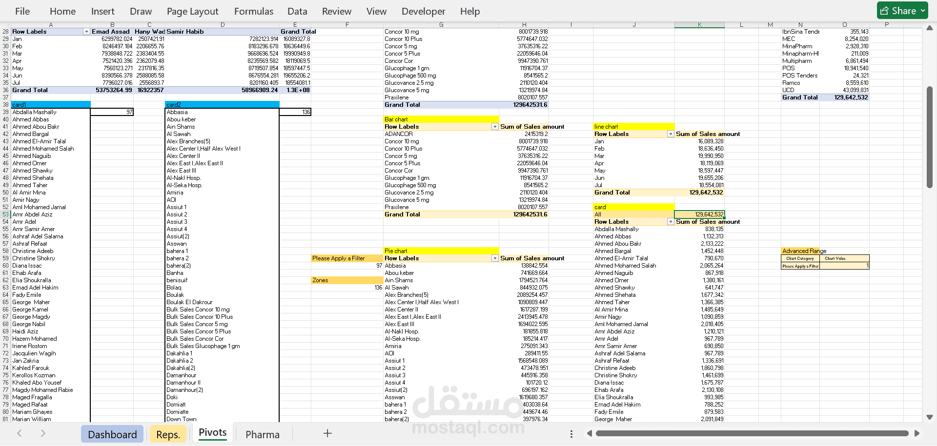 المميزات: يحتوي المشروع على العديد من سمات ال إكسل المتطورة، مثل الماكرو والرسوم البيانية والبطاقات الديناميكة، أيضا توجد استخدامات لمفاهيم متقدمة مثل الرسوم متعددة النطاق (Multi- Range) التي تظهر التقارير بصورة أكثر احترافية.