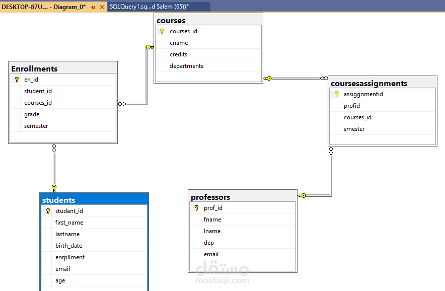 تم اضافة صورة توضح الـ ERD (Entity Relationship Diagram) الذي يمثل النتيجة النهائية للعمل على مشروع تصميم قاعدة بيانات لإدارة الطلاب باستخدام SQL Server. المخطط يوضح الجداول التي تم إنشاؤها والعلاقات بينها بعد التنفيذ العملي داخل SQL Server Management Studio