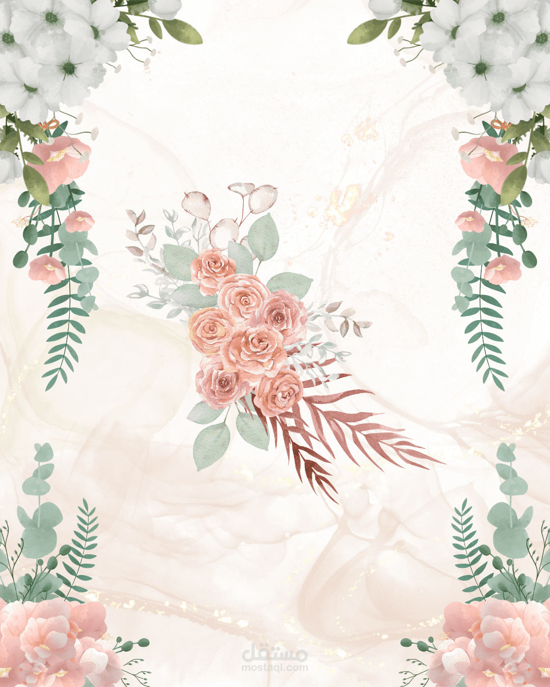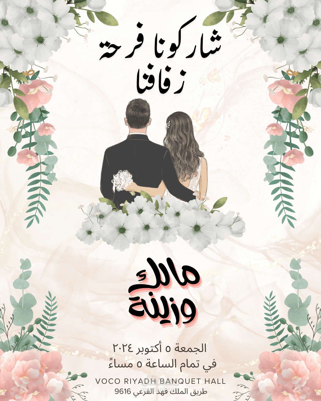 تزين الدعوة تفاصيل مميزة تتضمن أسماء العروسين مالك وزينة بخط بارز وأنيق، إضافة إلى تاريخ الحفل ومكانه بشكل منسق وواضح. الألوان الهادئة والزهور البيضاء والوردية تعكس الرقي والرومانسية، ما يجعل التصميم مثالياً لحفلات الزفاف الفخمة والعصرية.