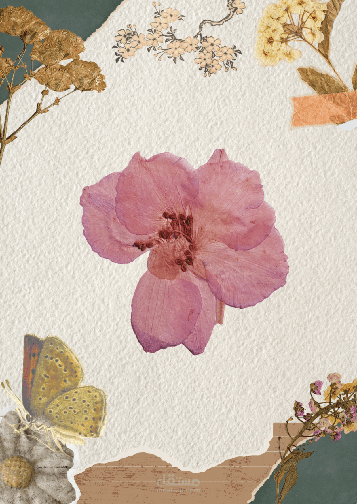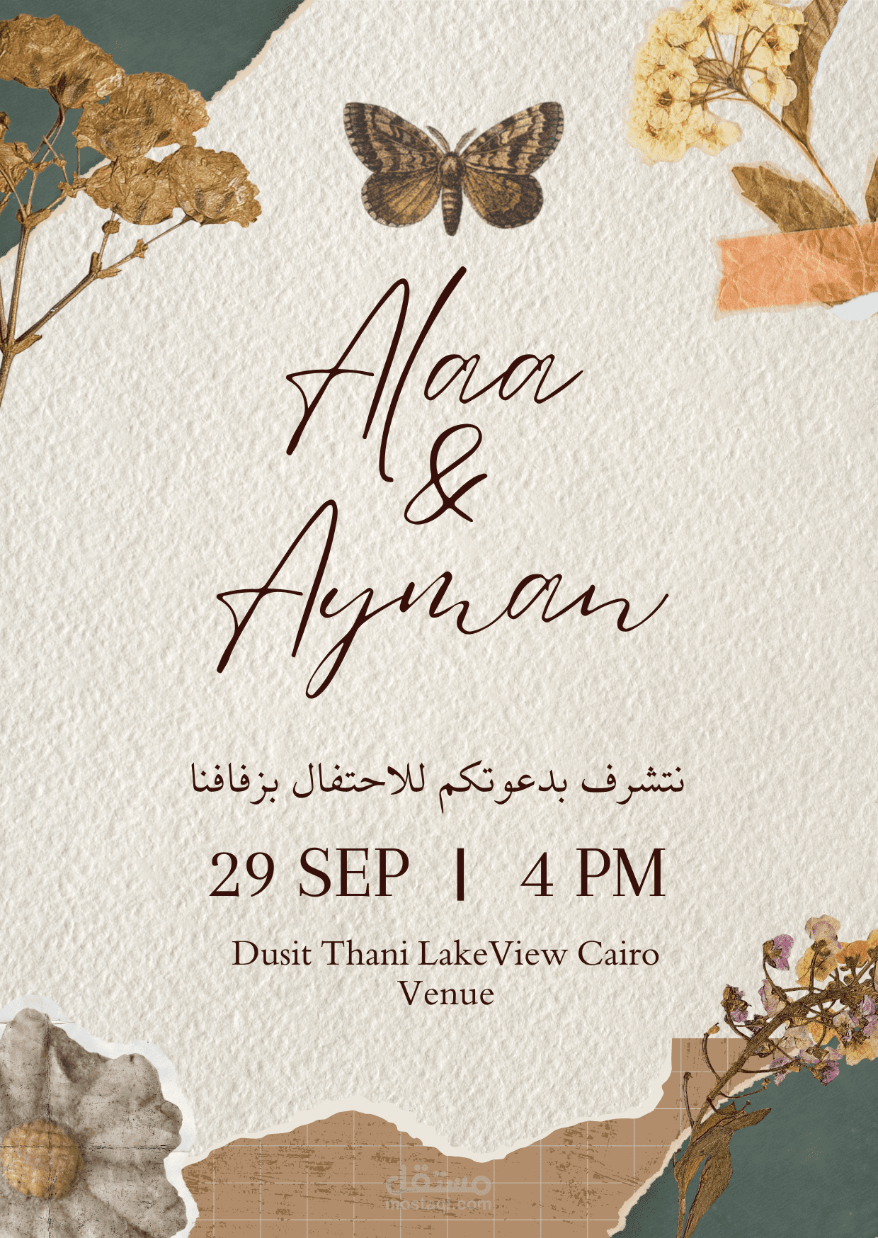 تصميم راقٍ وأنيق يعكس البساطة الممزوجة بالطبيعة، حيث تتزين الخلفية بملمس ورقي فاخر مع أزهار مجففة وفراشة أنيقة تضيف لمسة رومانسية دافئة. الألوان الهادئة واللمسات الطبيعية تمنح التصميم طابعاً كلاسيكياً جذاباً.