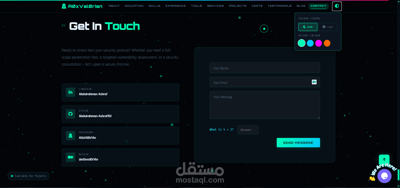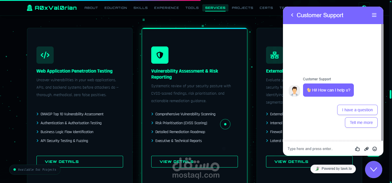 موقع محفظة المشاريع (Portfolio) الشخصي هو منصة إلكترونية تعرض مجموعة أعمالي ومهاراتي في مجالات البرمجة، الأمن السيبراني، تحليل الثغرات، وتطوير الويب. تم بناءه ليكون واجهة احترافية تُبيّن خبرتي وإمكانياتي لأصحاب المشاريع والعملاء المحتملين.