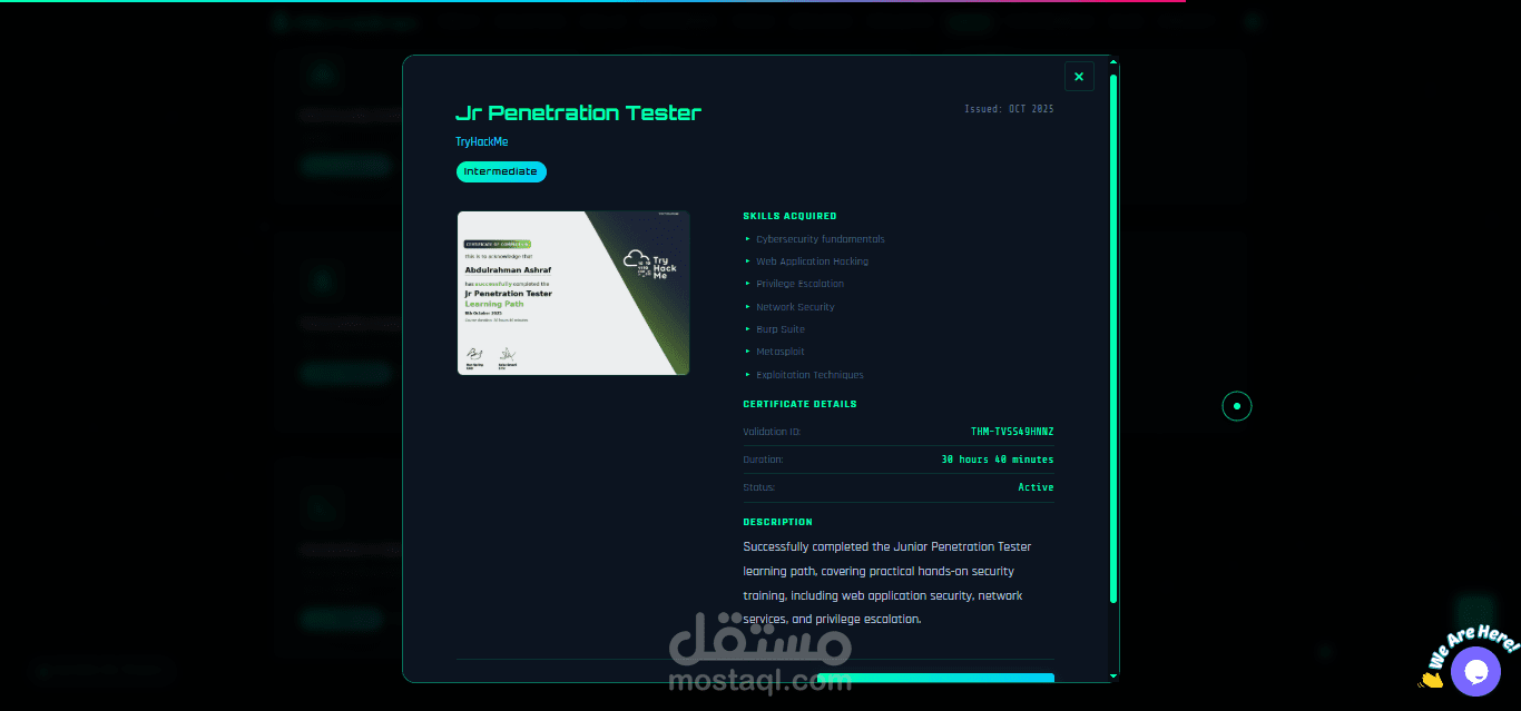 تنظيم المهارات: عرض منظم لمجالات خبرتي مثل اختبار الاختراق، تقييم الثغرات، التقرير التقني، وتطوير واجهات الاستخدام.