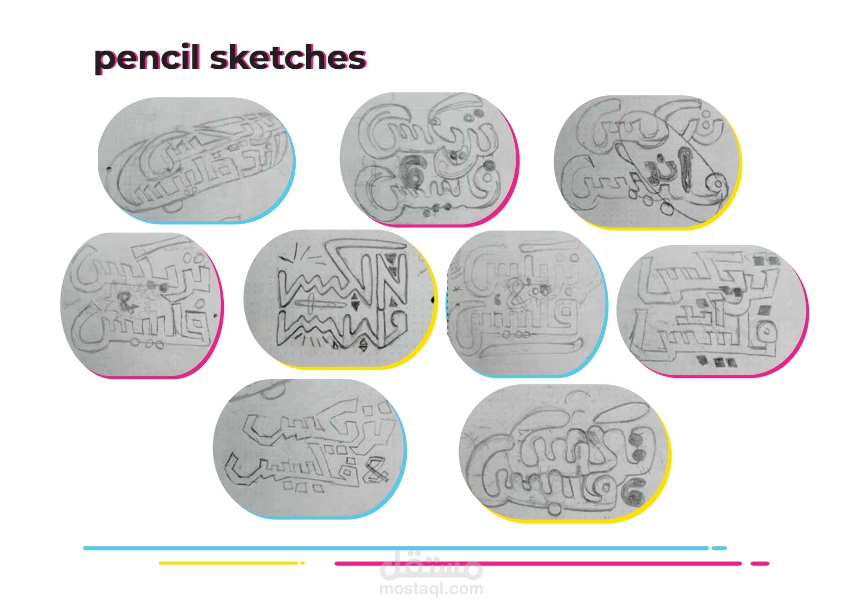 مرحلة العصف الذهني: رسم عدة مقترحات أولية لشعارات نصية (Wordmark).