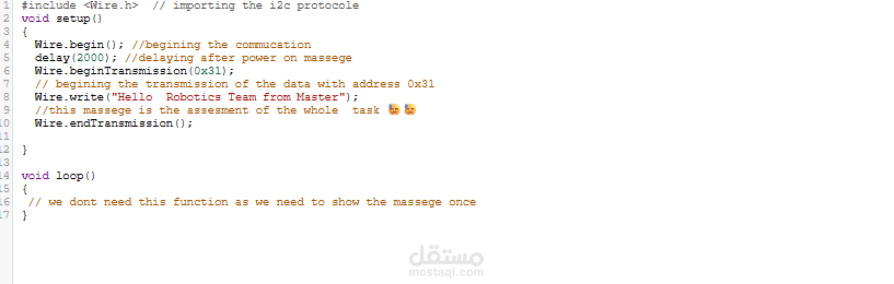 كود الأردوينو الرئيسي (Master): تم كتابة كود بسيط يقوم بإرسال رسالة نصية مرة واحدة فقط عند بدء التشغيل إلى عنوان محدد للـ Slave وهو 0x31. لم يتم استخدام دالة loop لإرسال الرسالة مرة واحدة فقط.