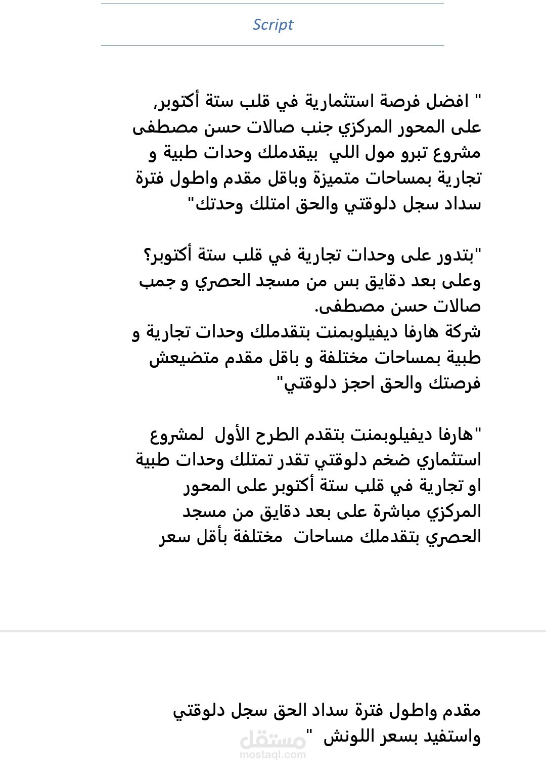 كتابة سكريبت لشركة تطوير عقاري في حي السادس من اكتوبر في مصر بمجافظة الجيزة وكان المشروع عن وحدات تجارية و وحدات طبية و كان الاعلان عن الطرح الاول للمشروع