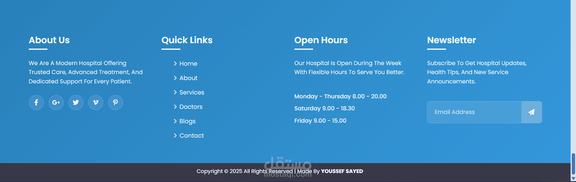 مطور متخصص في بناء وتصميم واجهات مواقع عصرية باستخدام HTML, CSS,. أركز على إنشاء مواقع سريعة، متجاوبة، وتفاعلية تناسب جميع الأجهزة وتوفر تجربة استخدام سهلة وممتعة. أهتم دائمًا بجودة الكود، وتحسين تجربة المستخدم (UI/UX)، واستخدام أحدث التقنيات لتقديم حلول احترافية.
