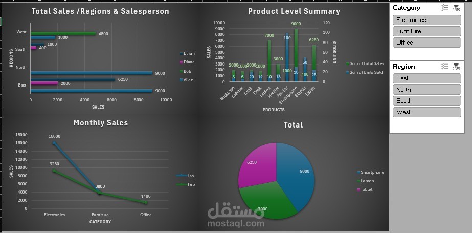 Total Sales / Regions & Salesperson: مقارنة المبيعات حسب المناطق (East, North, South, West) ومندوبي المبيعات (Ethan, Diana, Bob, Alice).