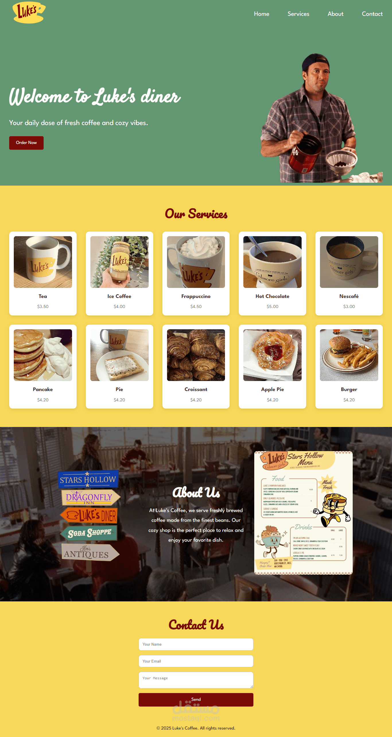 Landing page متجاوبة لبراند خيالي مستوحى من Luke’s Diner، تم تنفيذها باستخدام HTML, CSS, وJavaScript مع واجهة جذابة وحركات سلسة، وتصميم متوافق مع مختلف الأجهزة