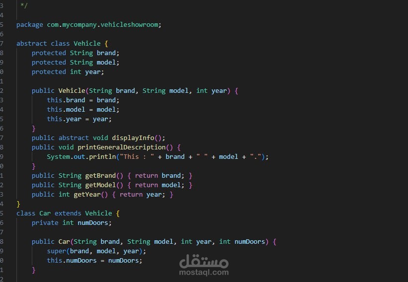 "قمت بتطوير مشروع بلغة Java يوضح مفاهيم البرمجة كائنية التوجه (OOP) مثل الوراثة (Inheritance) والكلاسات المجردة (Abstract Classes). المشروع يمثل نظام عرض سيارات (Vehicle Showroom) حيث يحتوي على كلاس مجرد Vehicle يحدد الخصائص العامة (brand, model, year) والعمليات الأساسية مثل طباعة الوصف العام. ثم قمت بإنشاء كلاس Car يرث من Vehicle ويضيف خاصية إضافية مثل عدد الأبواب (numDoors). المشروع يوضح كيفية إعادة استخدام الكود (Code Reusability) وتطبيق مبادئ الـ Abstraction و Encapsulation."