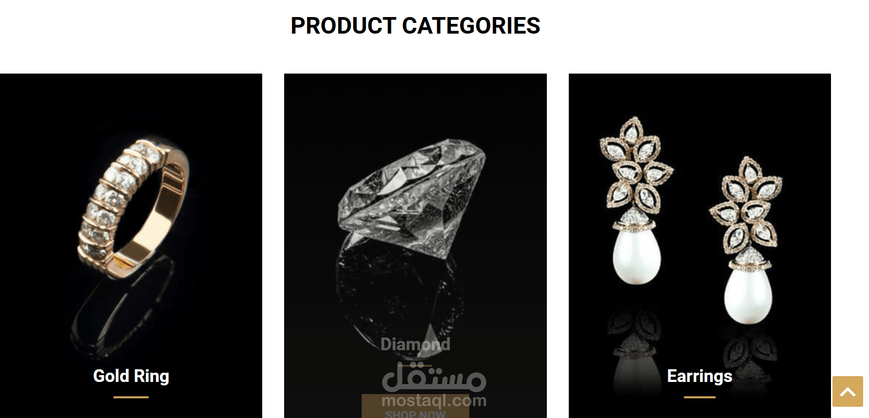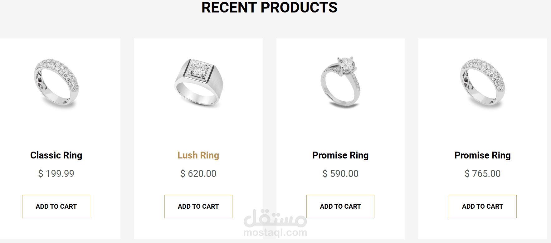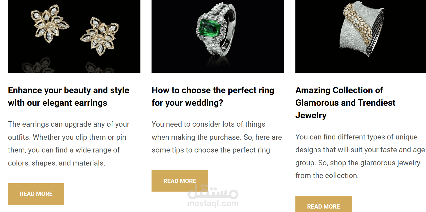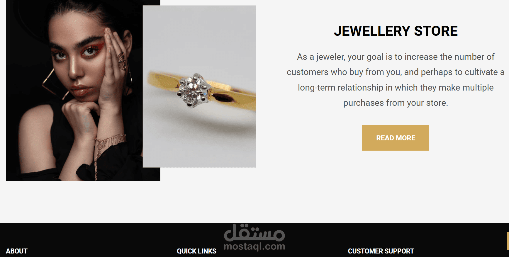 This is an elegant eCommerce website designed for selling luxury jewelry. At the top, it has a black header with social media icons (Facebook, Twitter, LinkedIn), customer support contact information, and quick links for "My Account" and "Contact."