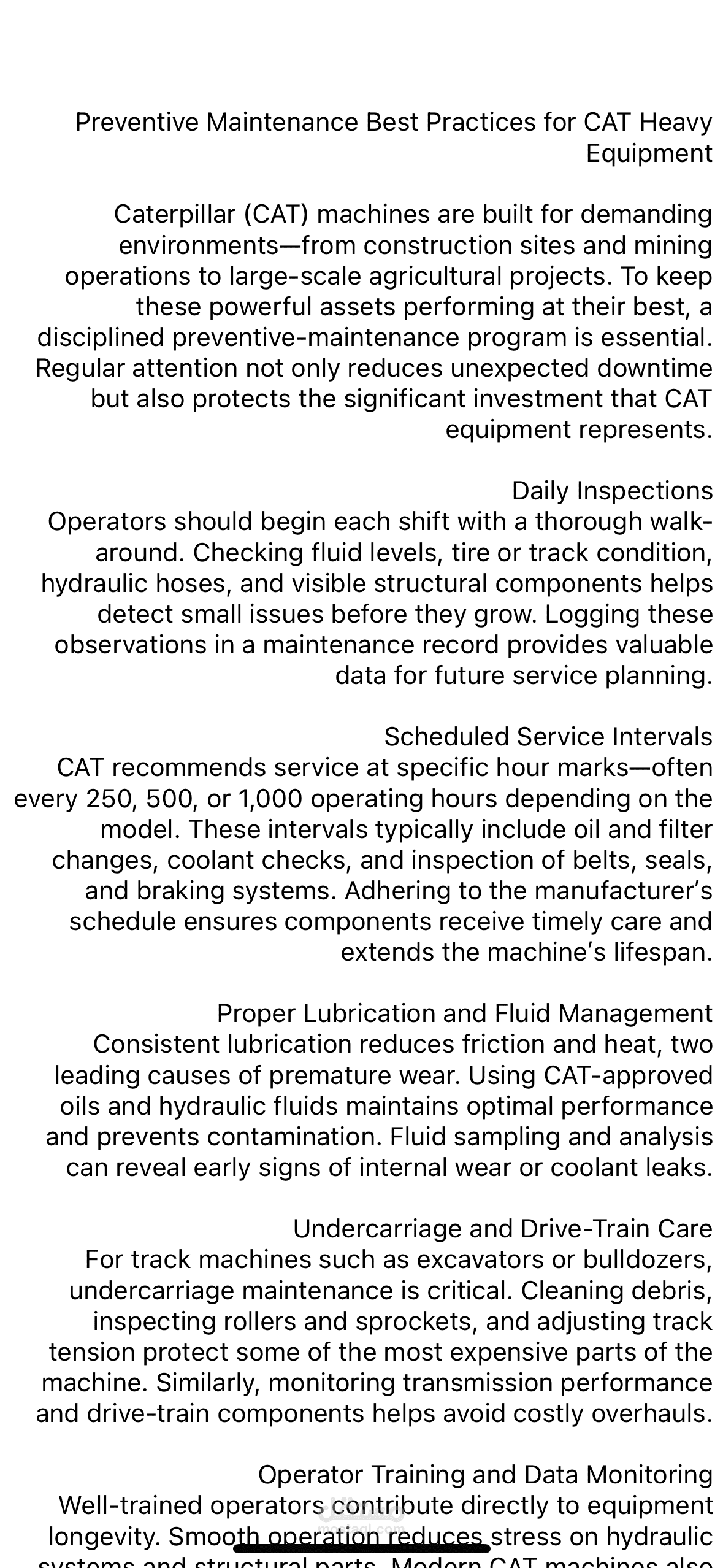 Caterpillar (CAT) machines are built for demanding environments—from construction sites and mining operations to large-scale agricultural projects. To keep these powerful assets performing at their best, a disciplined preventive-maintenance program is essential. Regular attention not only reduces unexpected downtime but also protects the significant investment that CAT equipment represents.